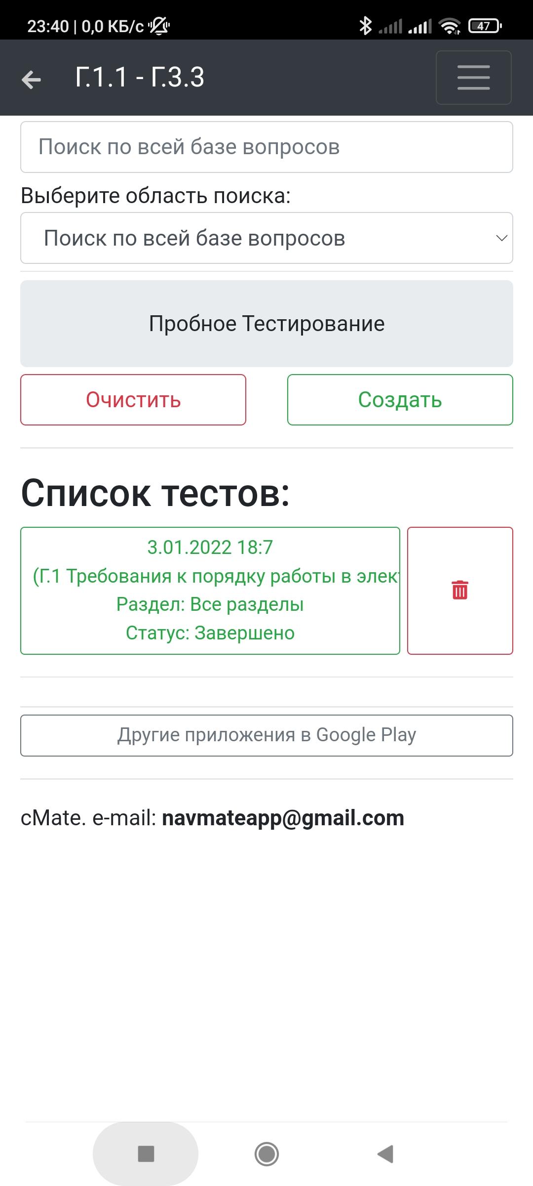 Приложение содержит полную базу вопросов и ответов с возможностью пройти пробный тест.