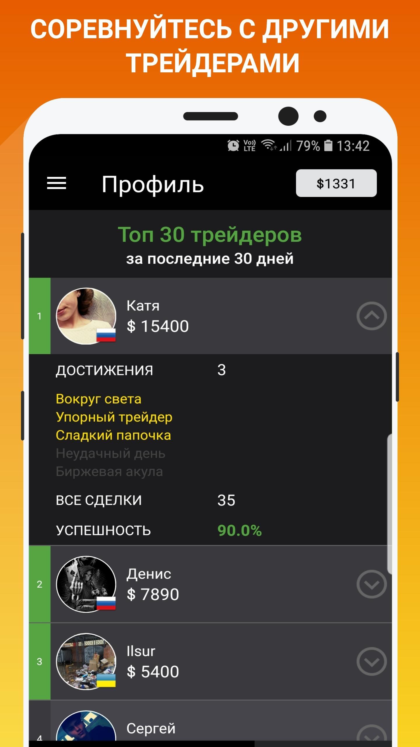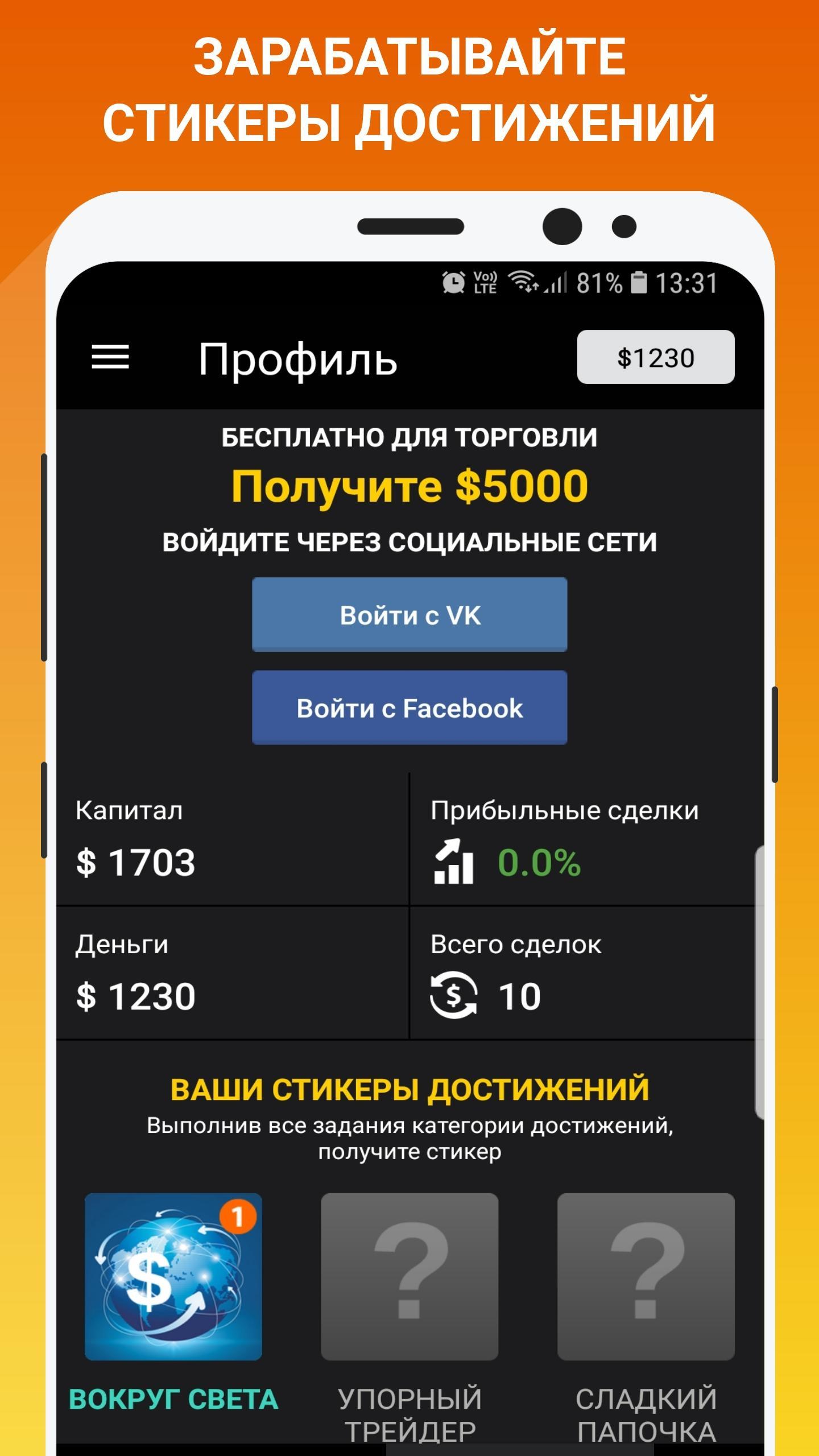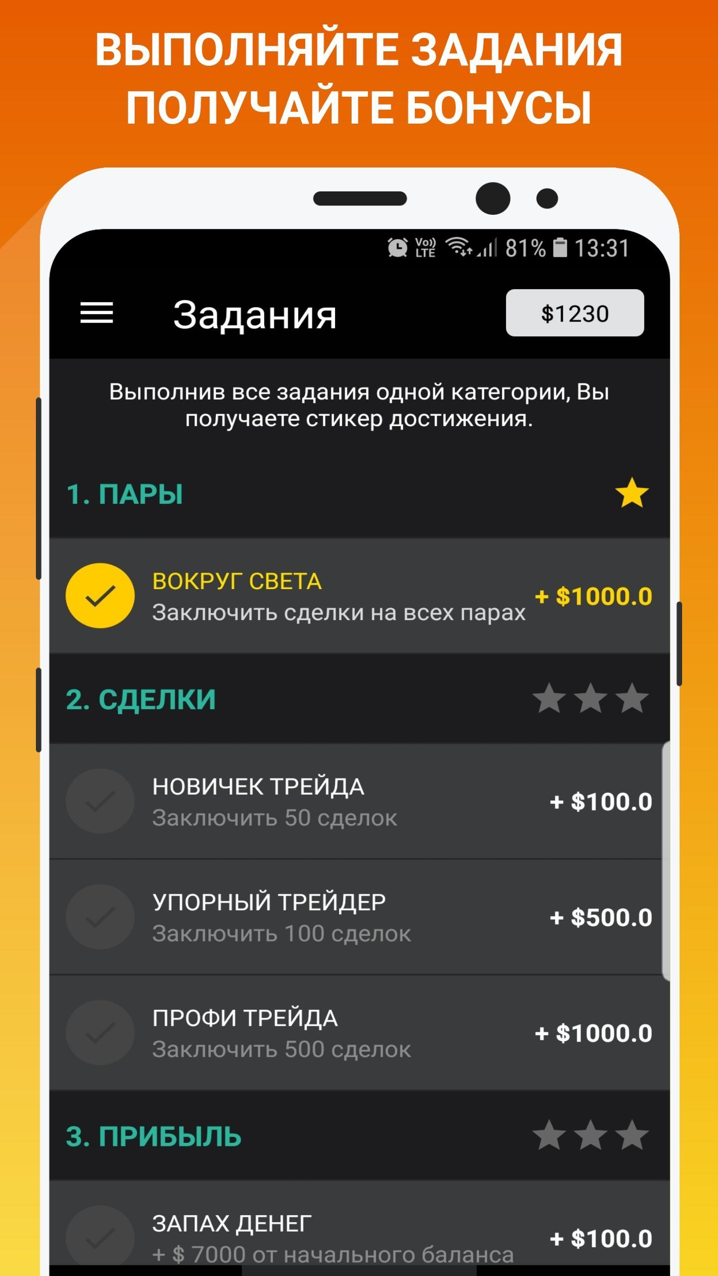 You will be able to get the basic skills of online trading. Exchange rates are taken from the real exchange. In addition to the bidding simulator, there are also game elements in the application, various tasks, for which you will receive bonuses and stickers.