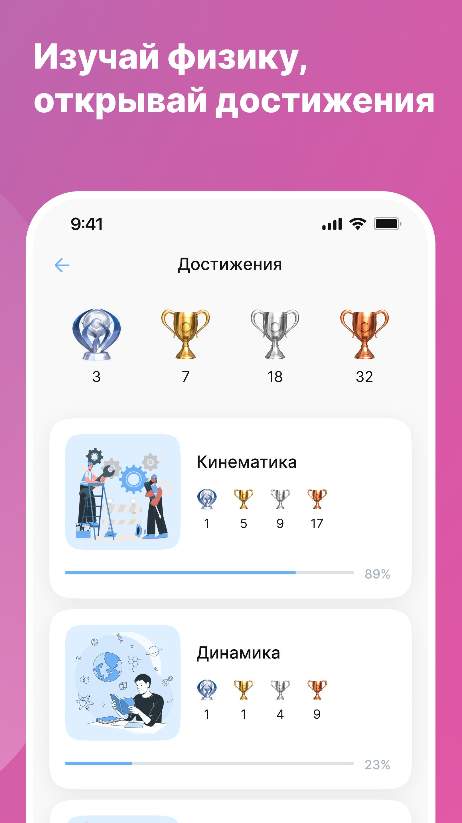 The application is ideal for preparing for the Unified State Exam and the Unified State Exam in physics. The whole theory is divided into topics and sections, for example, electrodynamics, kinematics and molecular physics. Each text and article is supplemented by practice: assignments and tests to test and consolidate knowledge.