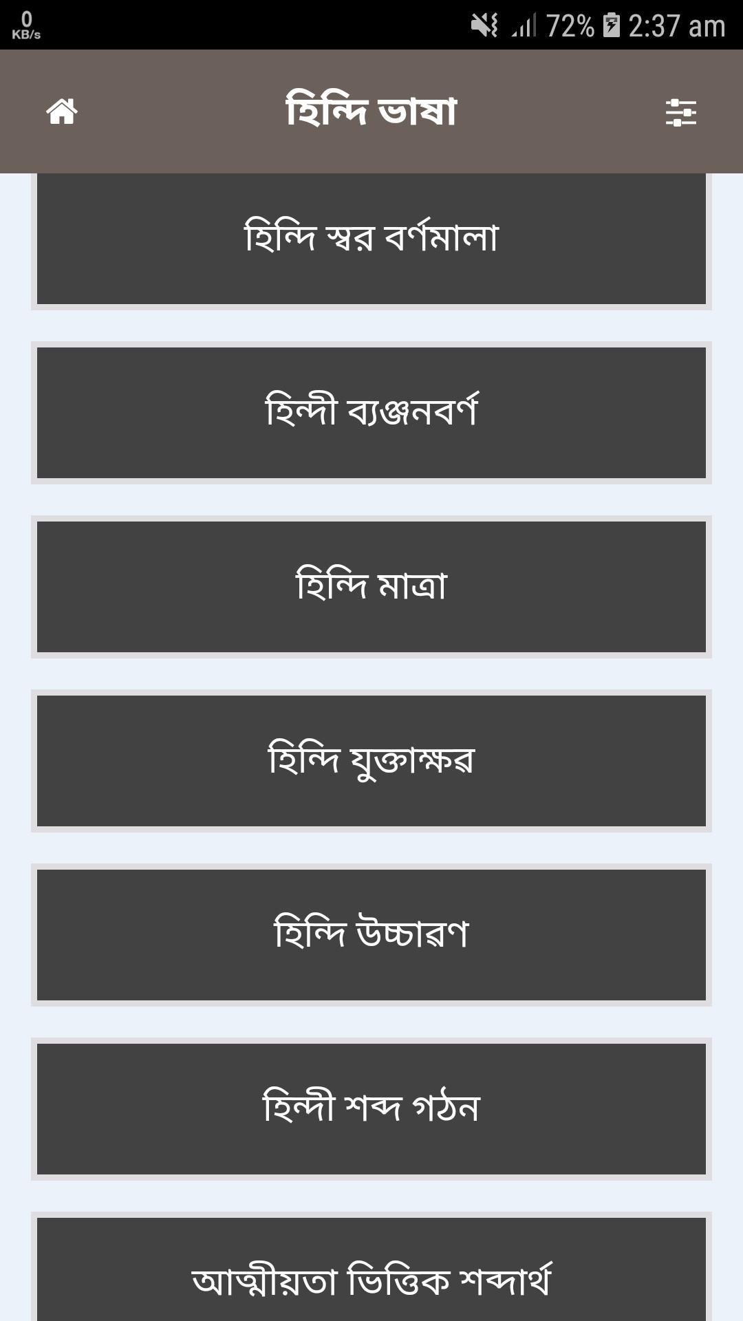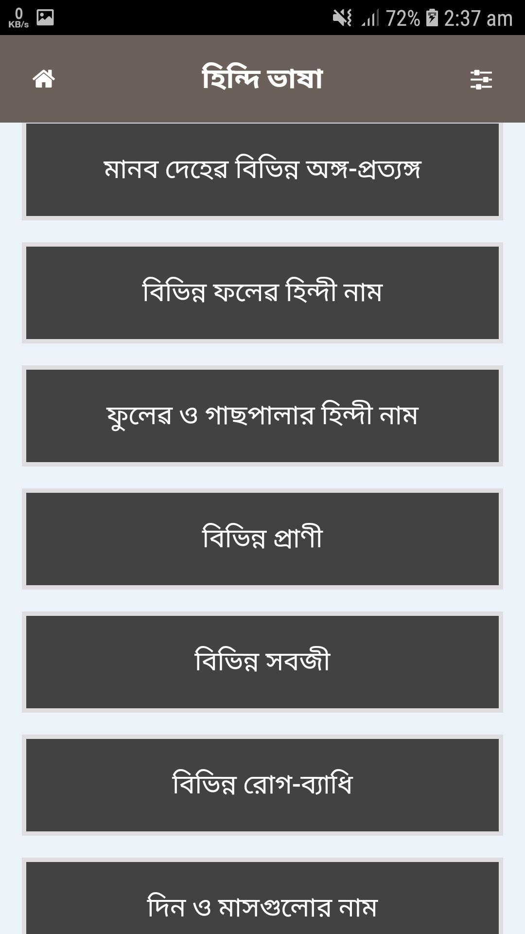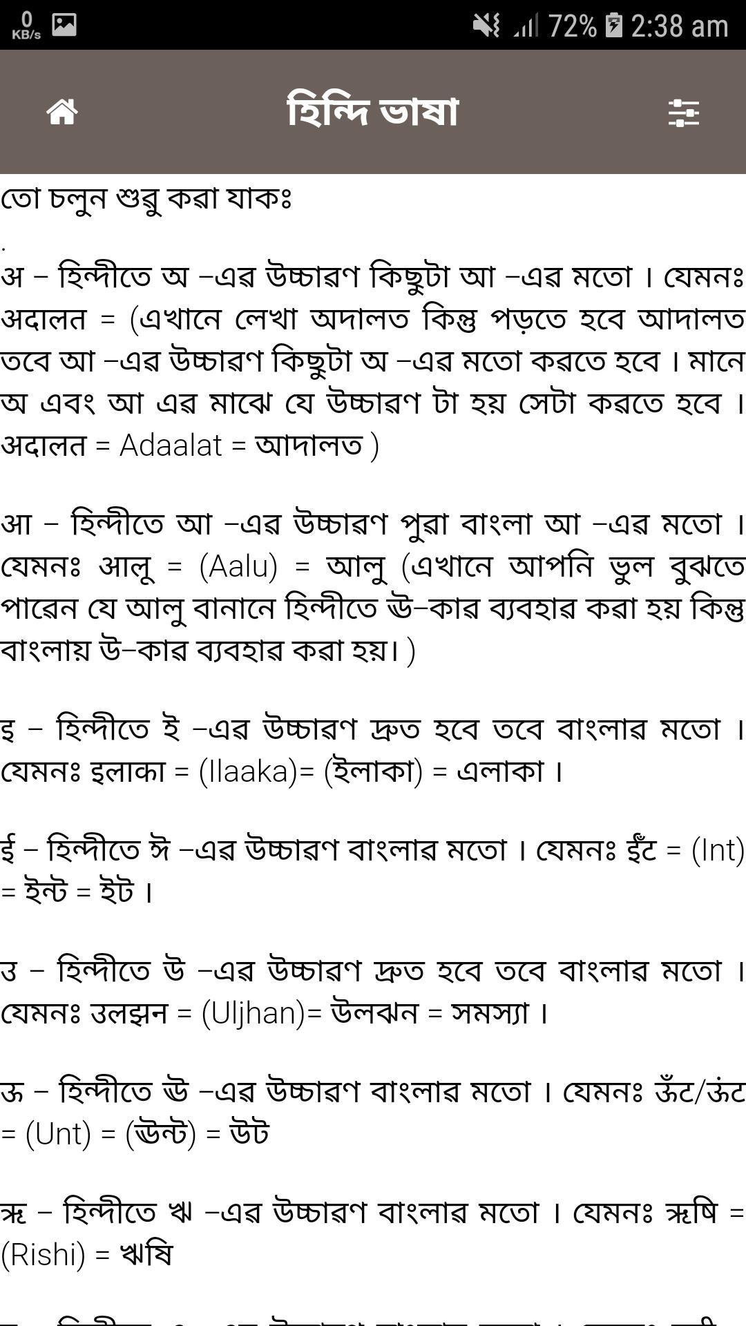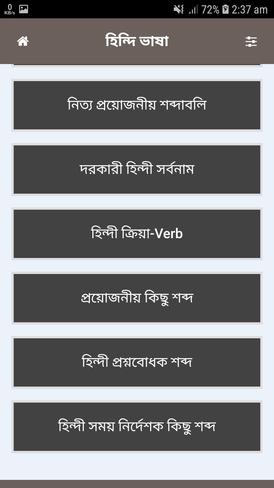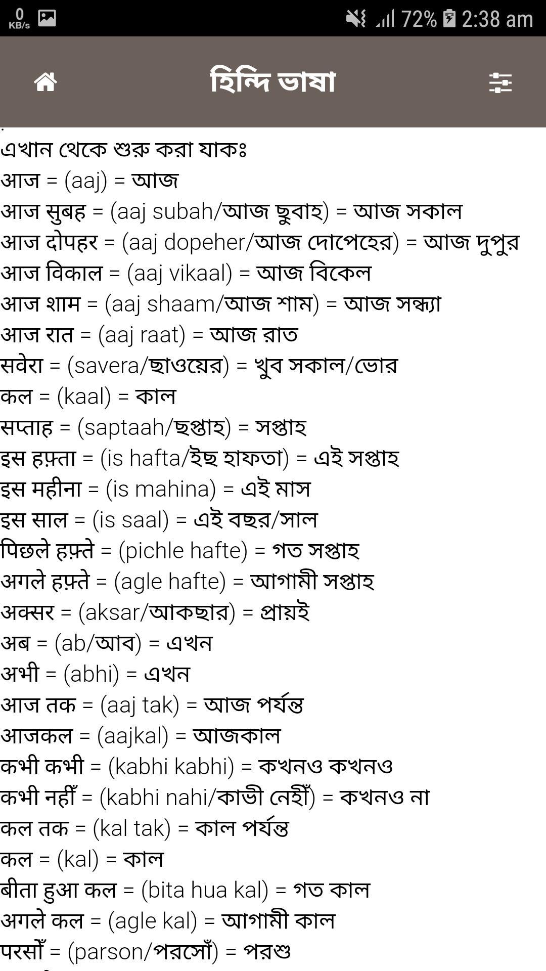 learn hindi in bangla is a bengali to hindi language learning app . By using this learn hindi to bangla apps you can speak hindi very easily. In this hindi to bangla speaking app you will get lots of hindi vocabulary with pronunciation and meaning. Those are very helpful to learn hindi in bangla. If you want to perfect in this language then you must need to use bengali to hindi dictionary. By using bengali to hindi dictionary you can learn lots of word meaning. Read hindi bangla book everyday .
