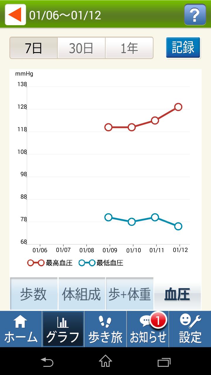 日々の歩数や、記録した体重/血圧を見やすいグラフで確認できます。