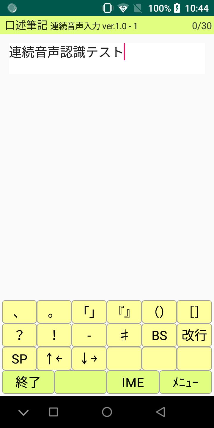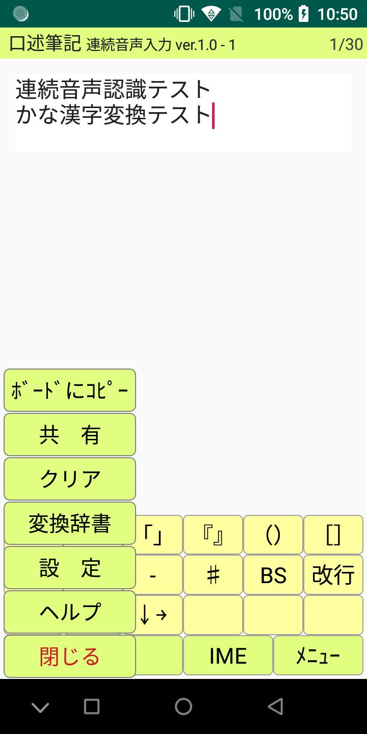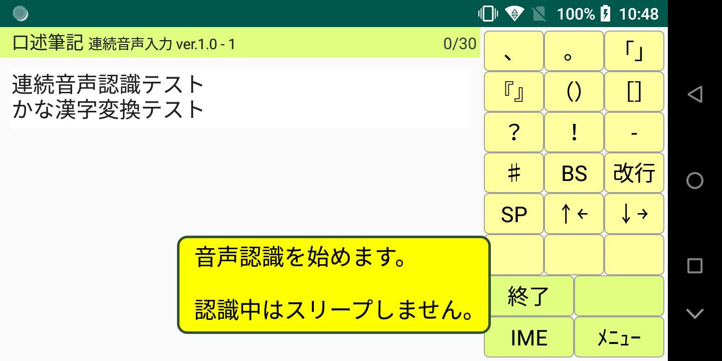 Google音声機能に拠る音声認識入力アプリです。 句読点や改行の入力と認識候補選択も音声で行なえます。 Android6から動作します(5は未確認)。