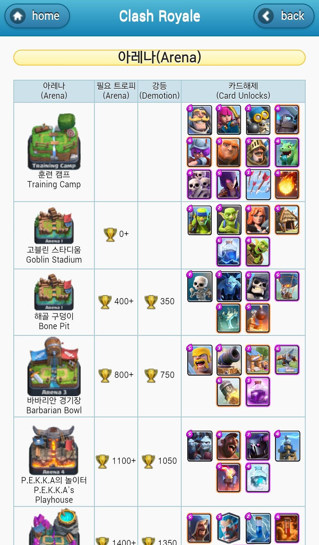 아레나(Arena)에 대한 필요 트로피, 강등 트로피, 카드해제 정보를 확인 할 수 있습니다.