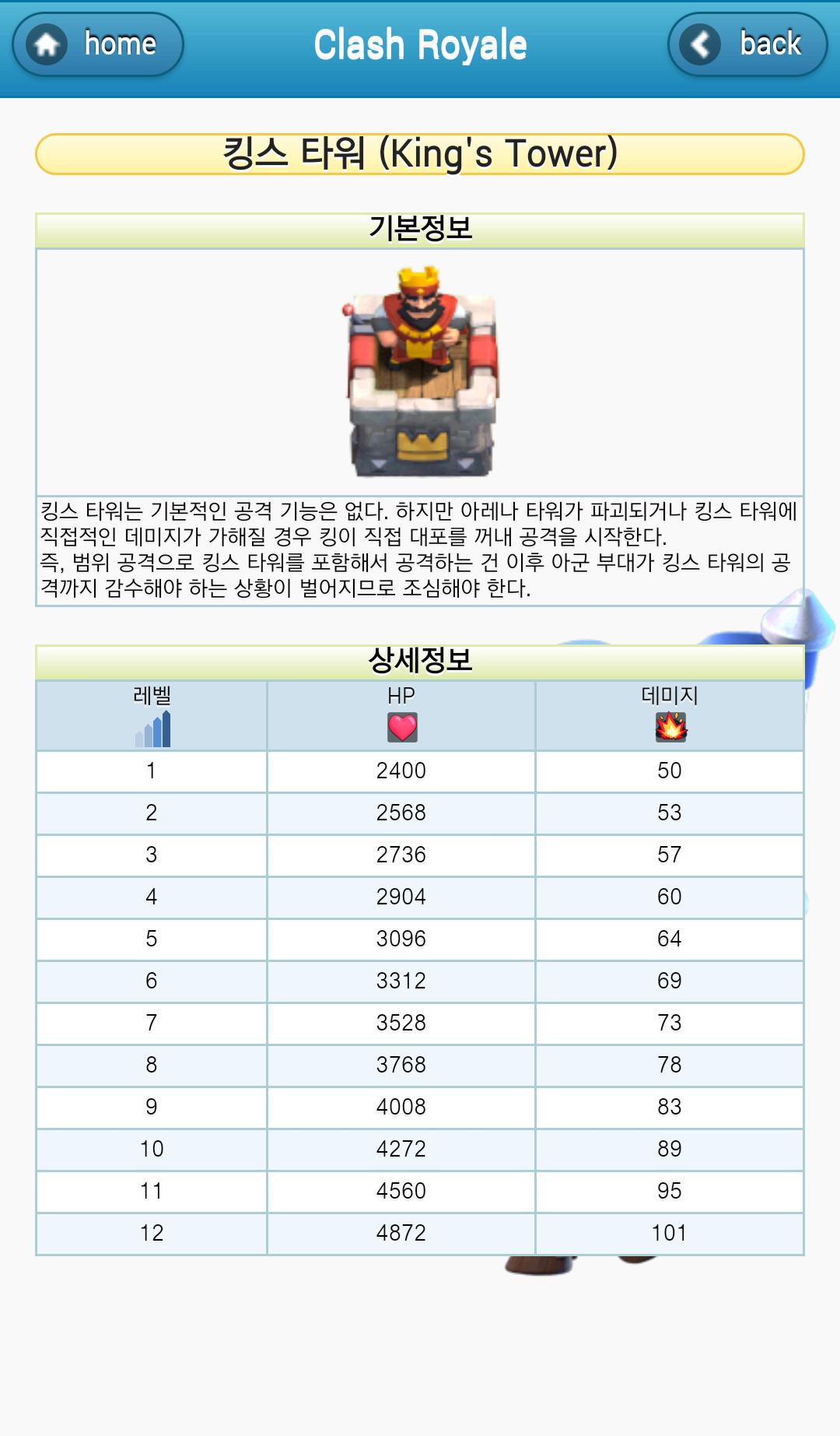킹스타워(King's Tower), 아레나 타워(Arena Towers)에 대한 레벨별 HP, 레벨별 데미지 정보를 확인 할 수 있습니다.