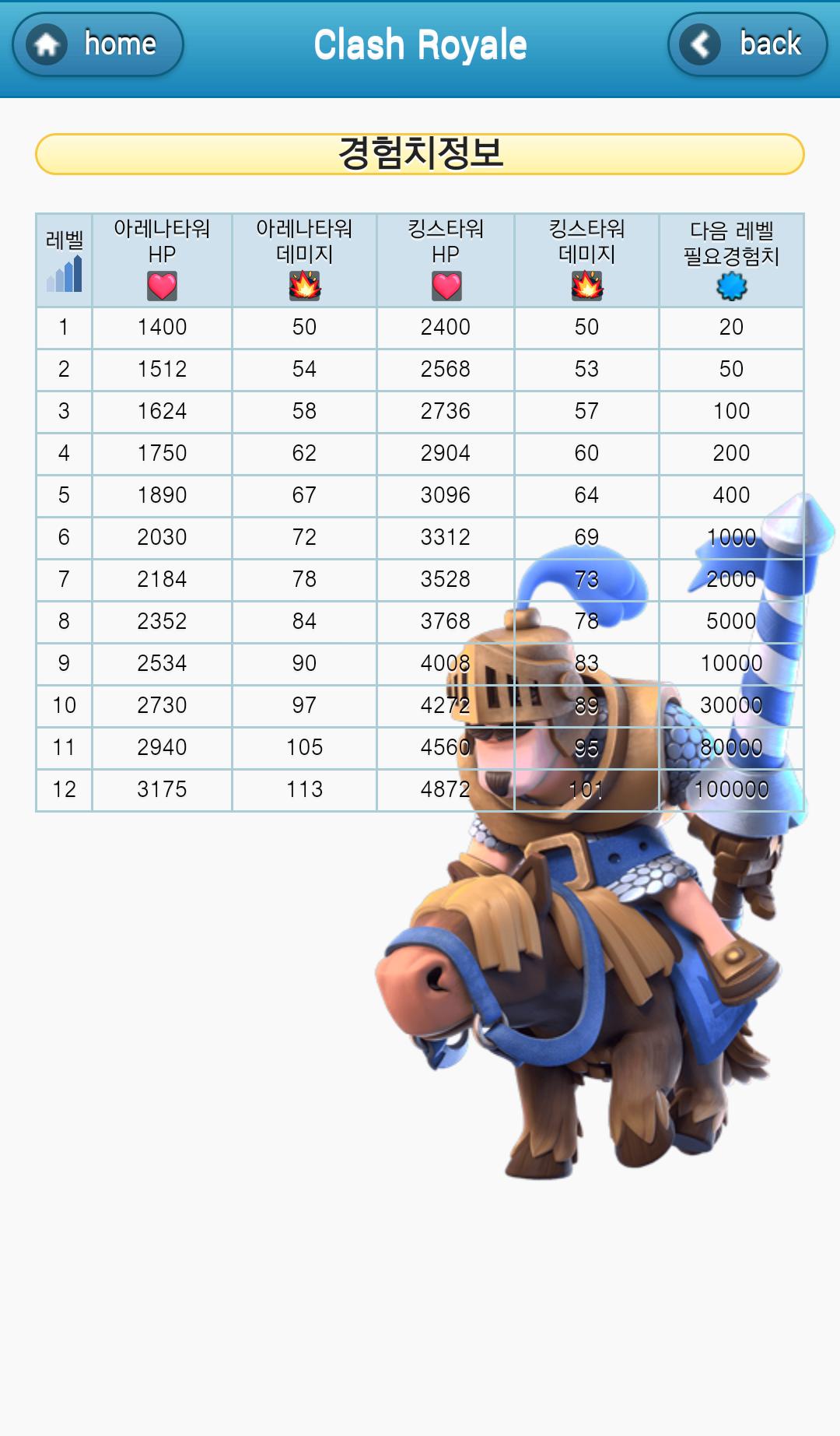 경험치에 대한 레벨별 아레나 타워 HP, 레벨별 아레나타워 데미지, 레벨별 킹스타워 HP, 레벨별 킹스타워 데미지, 레벨별 다음 레벨 필요 경험치 정보를 확인 할 수 있습니다.