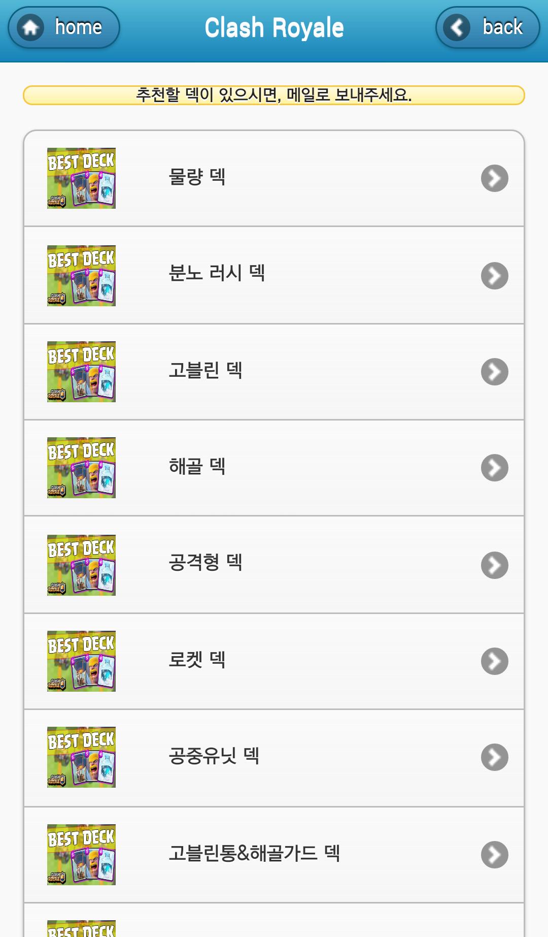 클래시 로얄의 추천 덱(물량 덱, 분노 덱, 고블린 덱, 해골 덱, 로켓 덱, 석궁 덱, 호그라이더 덱 등등)을 확인 할 수 있습니다.