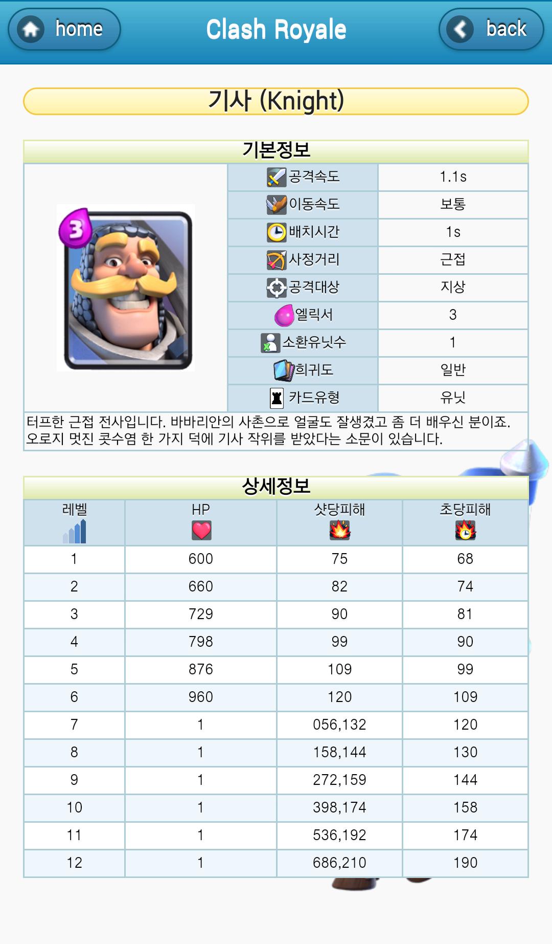 영웅병력카드들의 공격속도, 이동속도, 배치시간, 사정거리, 공격대상, 엘릭서, 소환유닛수, 희귀도, 카드유형, 레벨별 HP, 레벨별 샷당피해, 초당피해 정보를 확인 할 수 있습니다.