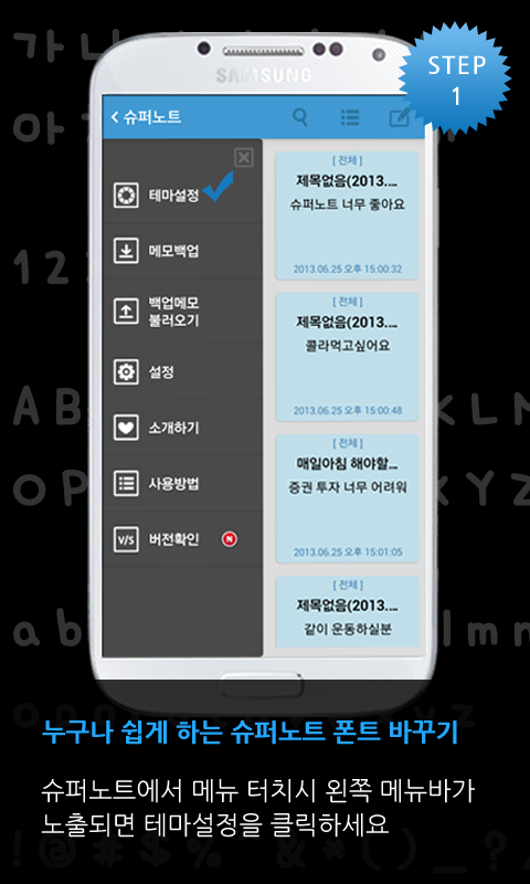2. 슈퍼노트 실행 후 메뉴를 눌러 테마설정을 선택하세요.