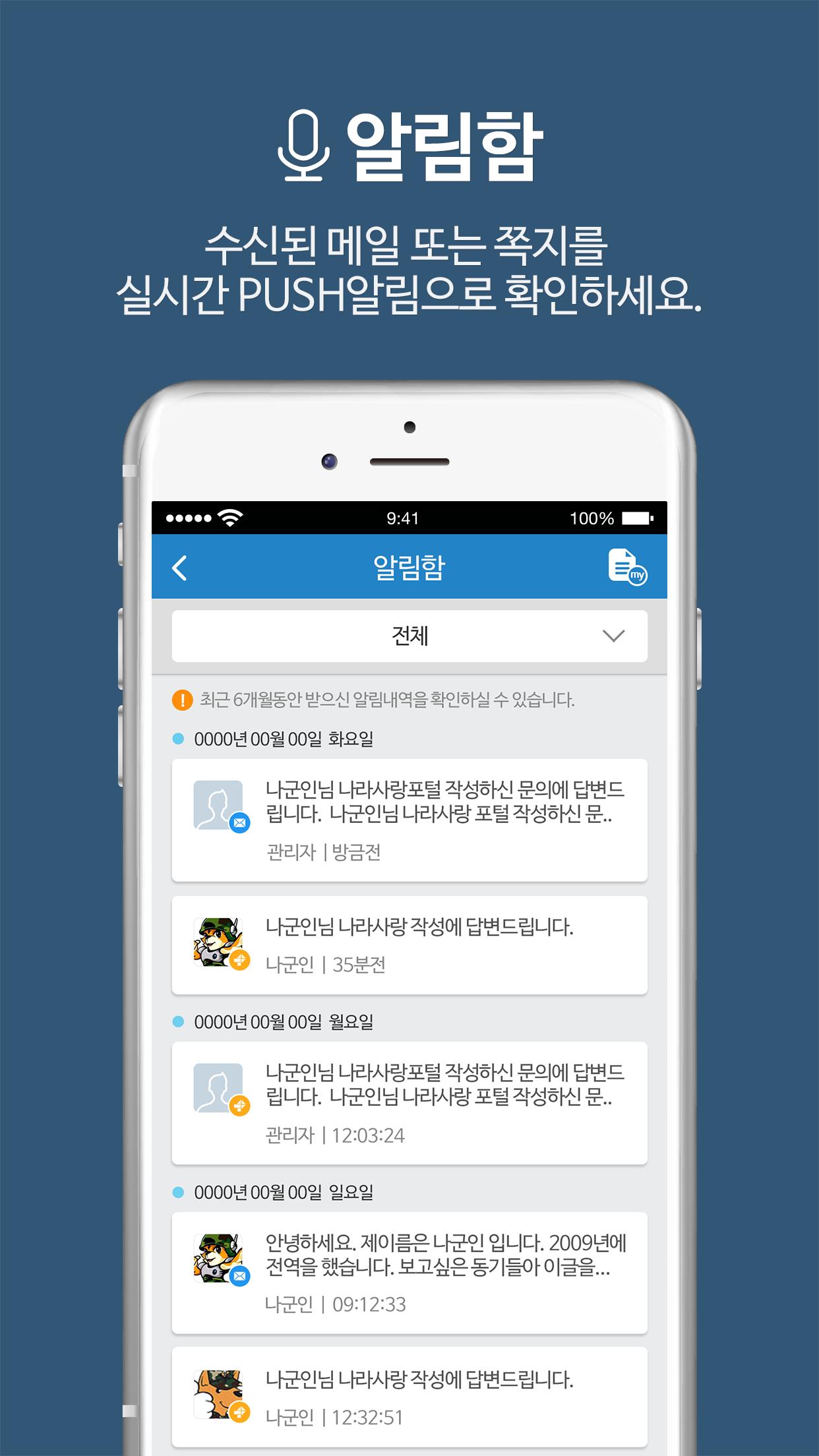 나라사랑카드 앱은 나라사랑포털의 제공 메뉴와 함께 실시간 PUSH 알림, 나라사랑카드를 활용한 병역정보 조회등을 제공하는 모바일 전용 서비스입니다.