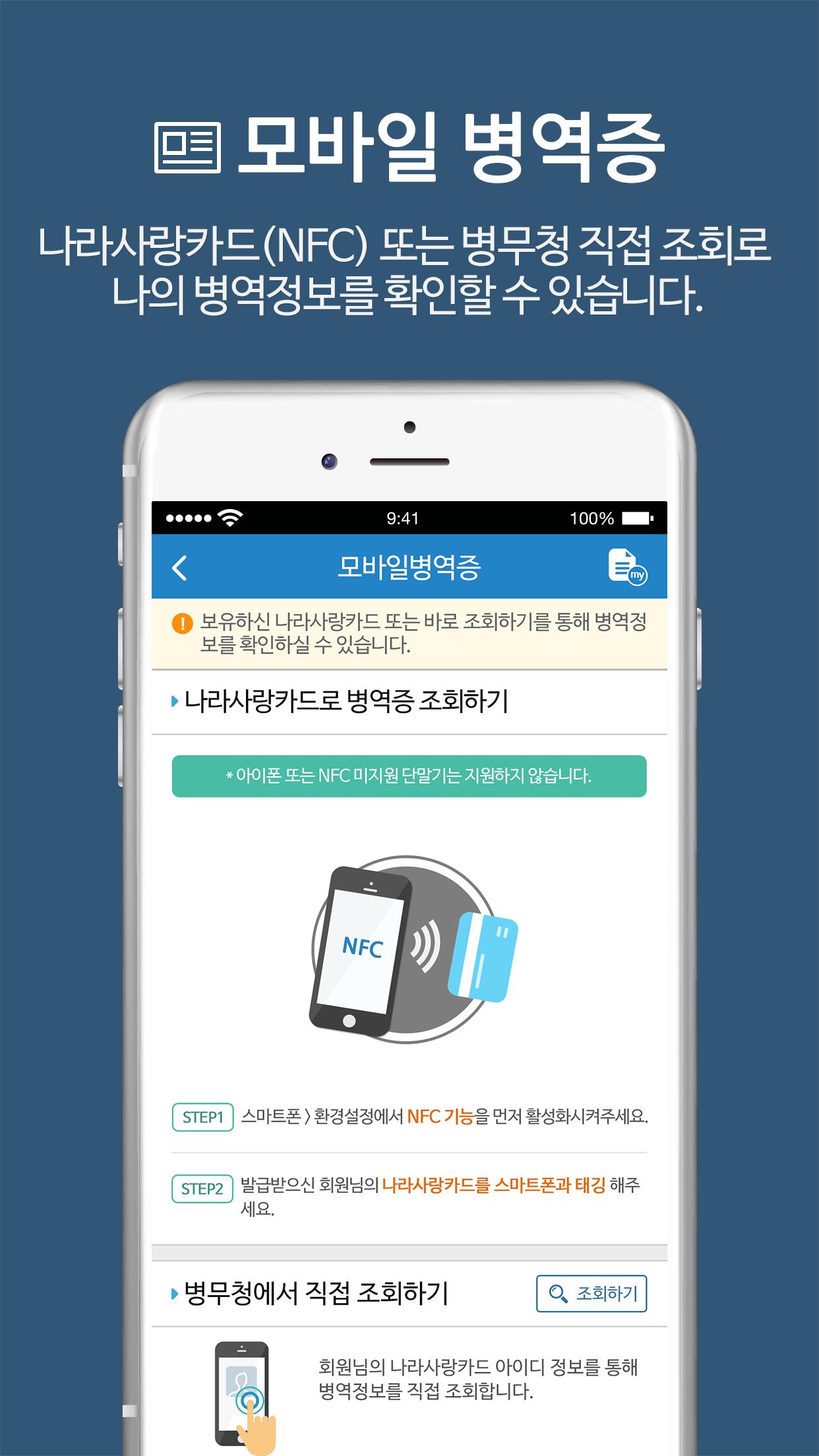 5. 병역증 / 전역증 조회 : 나라사랑카드 내에 있는 자신의 병역증 및 전역증 정보를 NFC를 통해 조회하거나 아이디로 조회할 수 있습니다.