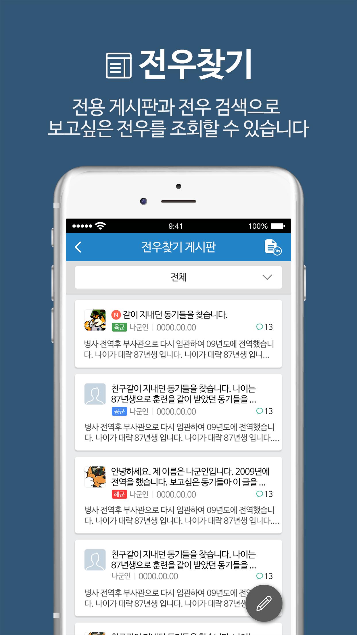 4. 커뮤니티 : 전용 게시판과 조회하기를 통한 전우찾기, SNS 찾기로 찾고 싶은 전우를 검색할 수 있습니다,