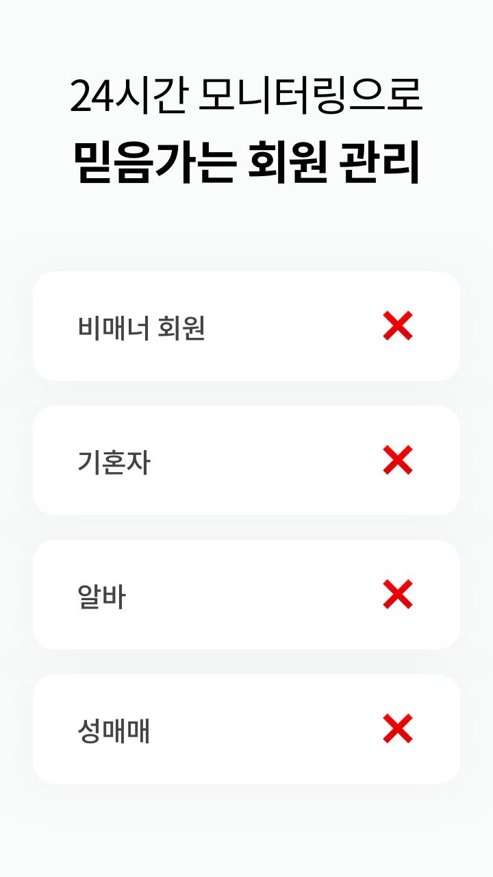 본 앱은 성매매를 목적으로 하지 않으며, 청소년 보호법을 준수하고 있으나 청소년에게 유해나 내용이 포함될 수 있으니 사용자의 주의가 필요합니다. 아동ㆍ청소년 포함 성매매를 알선, 권유, 유인, 강요하는 사람이나 성매매를 한 사람은 형사 처벌의 대상입니다. 음란하거나 선정적인 프로필 사진 및 성기ㆍ성행위를 비유해서 불건전 만남을 유도하는 게시글은 본 서비스에서 유통을 금지합니다.