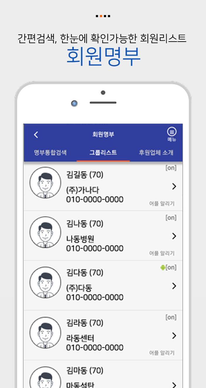 6. 회원명부에서 회원을 검색, 선택하면 사진과 연락처를 볼 수 있으며 전화나 이메일을 선택하여 즉시 발송할 수 있습니다. (별도의 회원수첩 책자 불요)