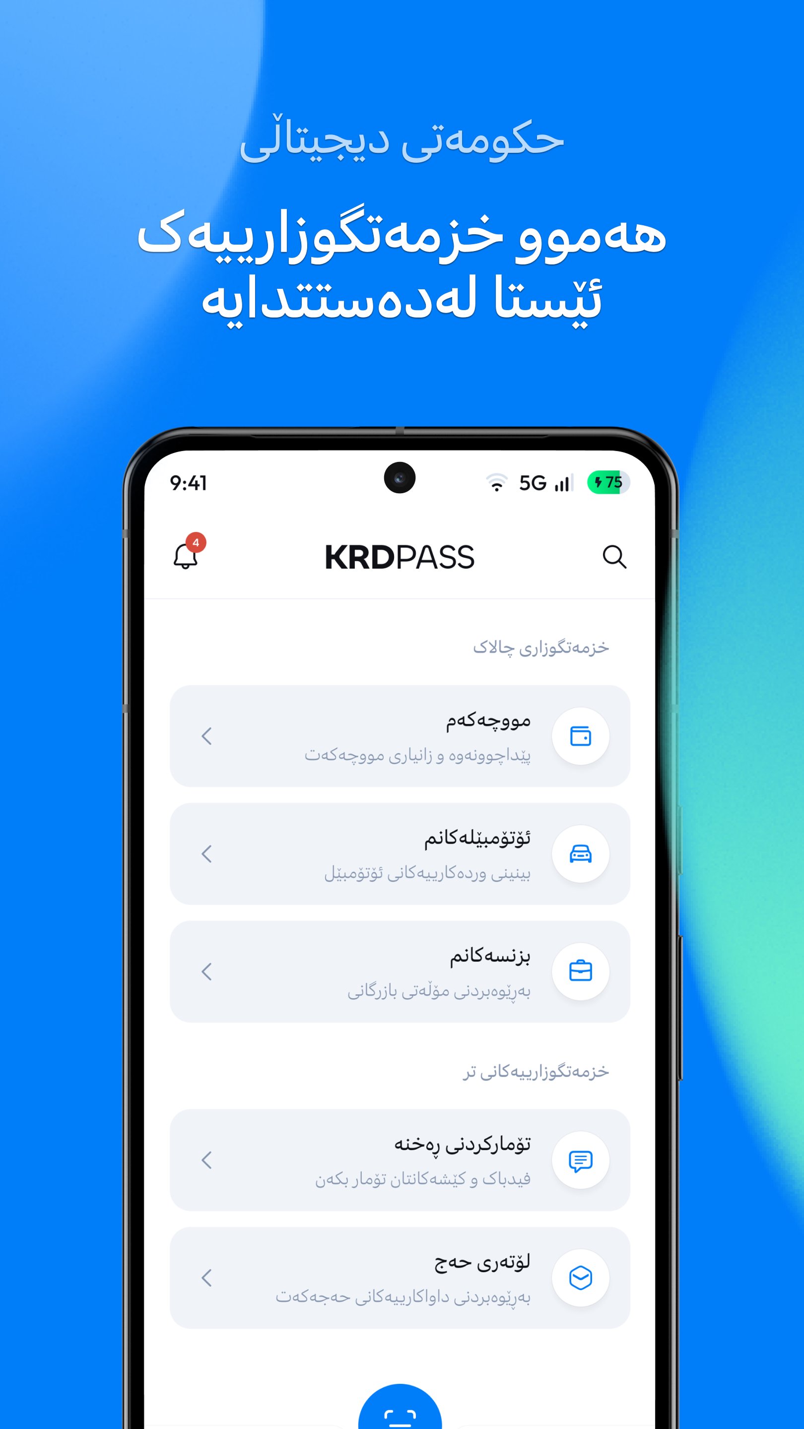 قم بتنزيل KRDPass اليوم واستمتع بمستقبل الخدمات الحكومية الرقمية في كردستان.