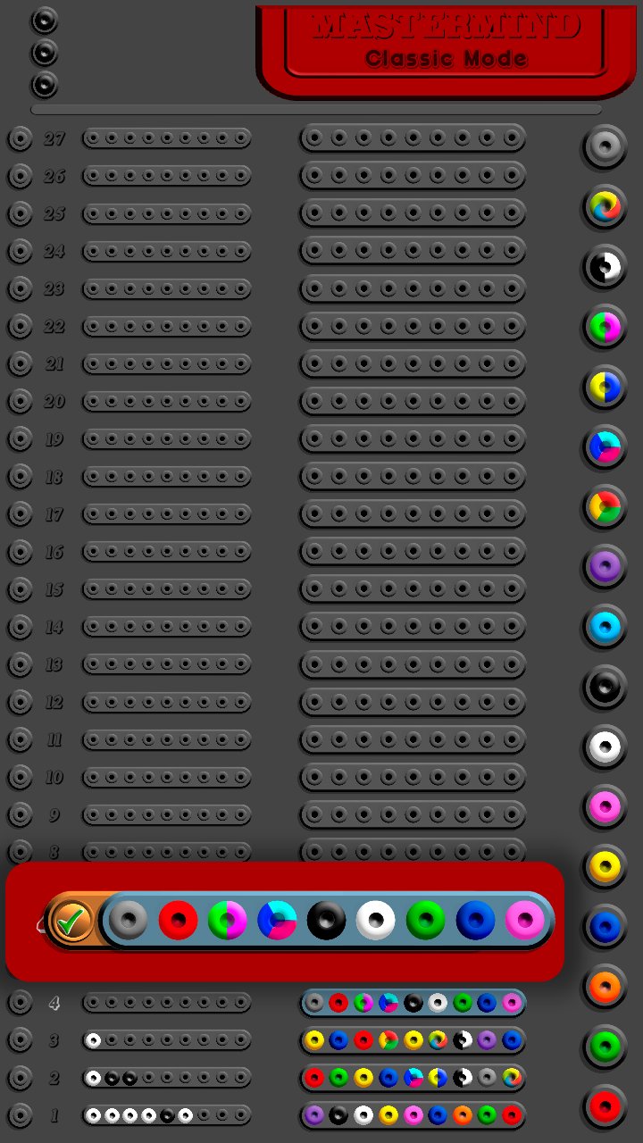 - كلاسيكي: هو وضع اللعبة الأصلي. موقف كل فكرة لا يتوافق مع موقف كل لون ، وهذا هو. الأدلة لا تضيف معلومات حول موقف من الألوان