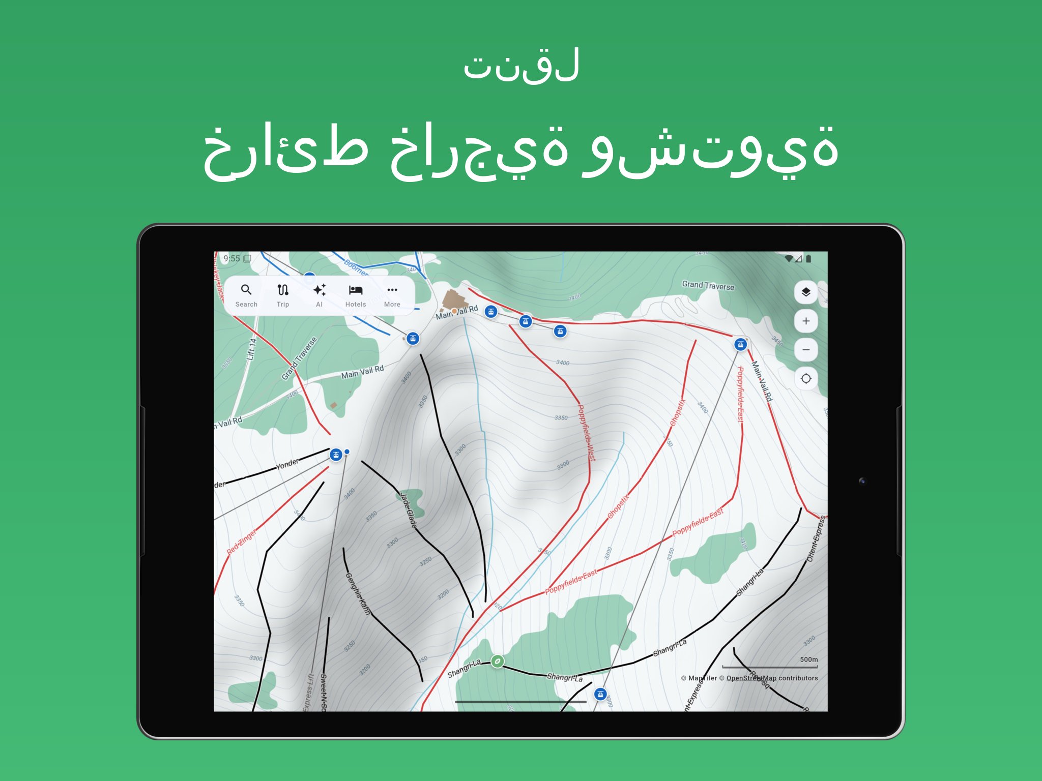 اختر من بين خرائط سفر متعددة بما في ذلك الخرائط الخارجية، والخرائط الشتوية المناسبة للتزلج، والخرائط الفضائية.