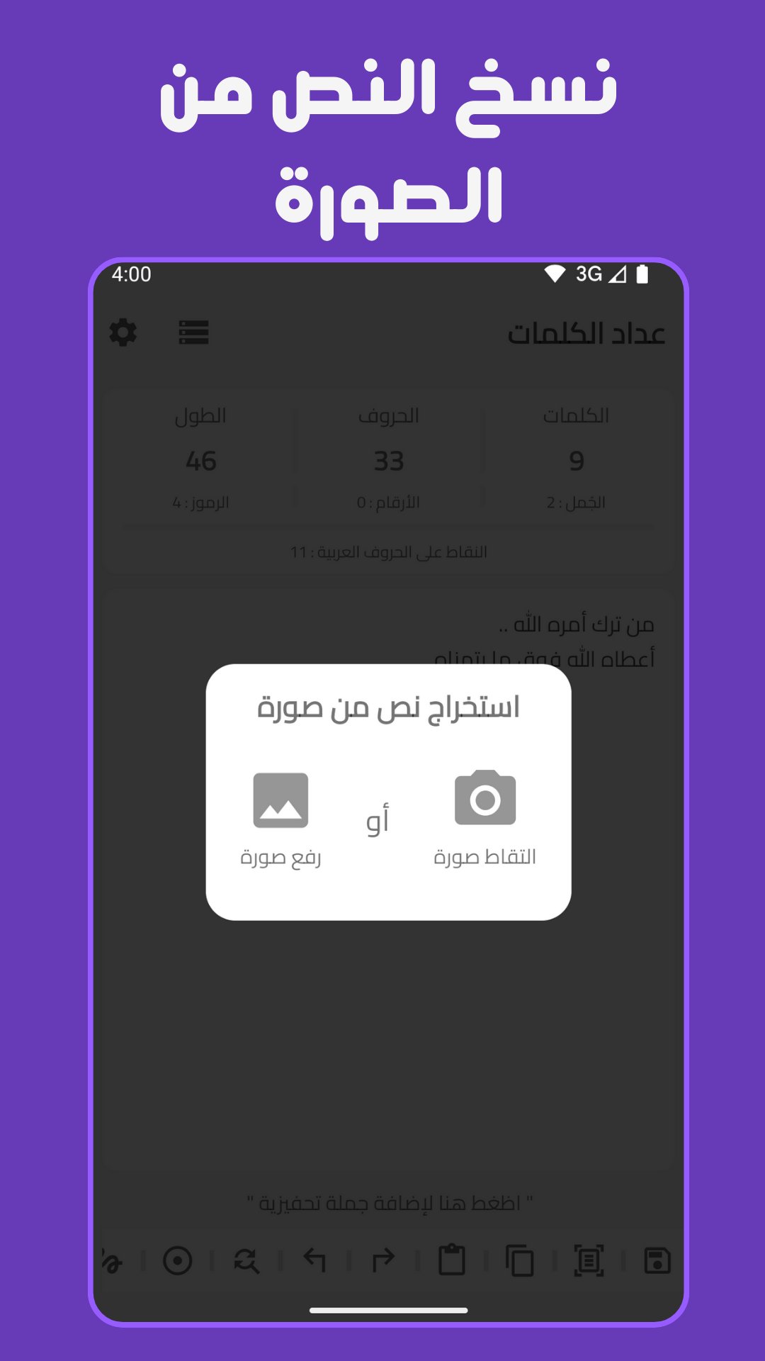 ⁍ تحويل الصورة إلى نص (OCR): التقط صورة لأي مستند أو ارفعها من معرض الصور لتحويلها فوراً إلى نص قابل للتعديل.