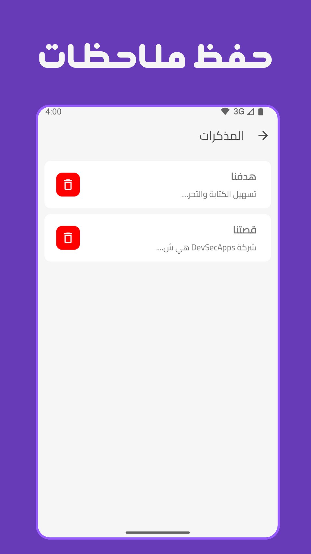 الحفظ الآمن داخل التطبيق: احفظ مسوداتك وملاحظاتك داخل التطبيق بخصوصية تامة؛ بياناتك محمية ولا يمكن ⁍ للتطبيقات الأخرى الوصول إليها.