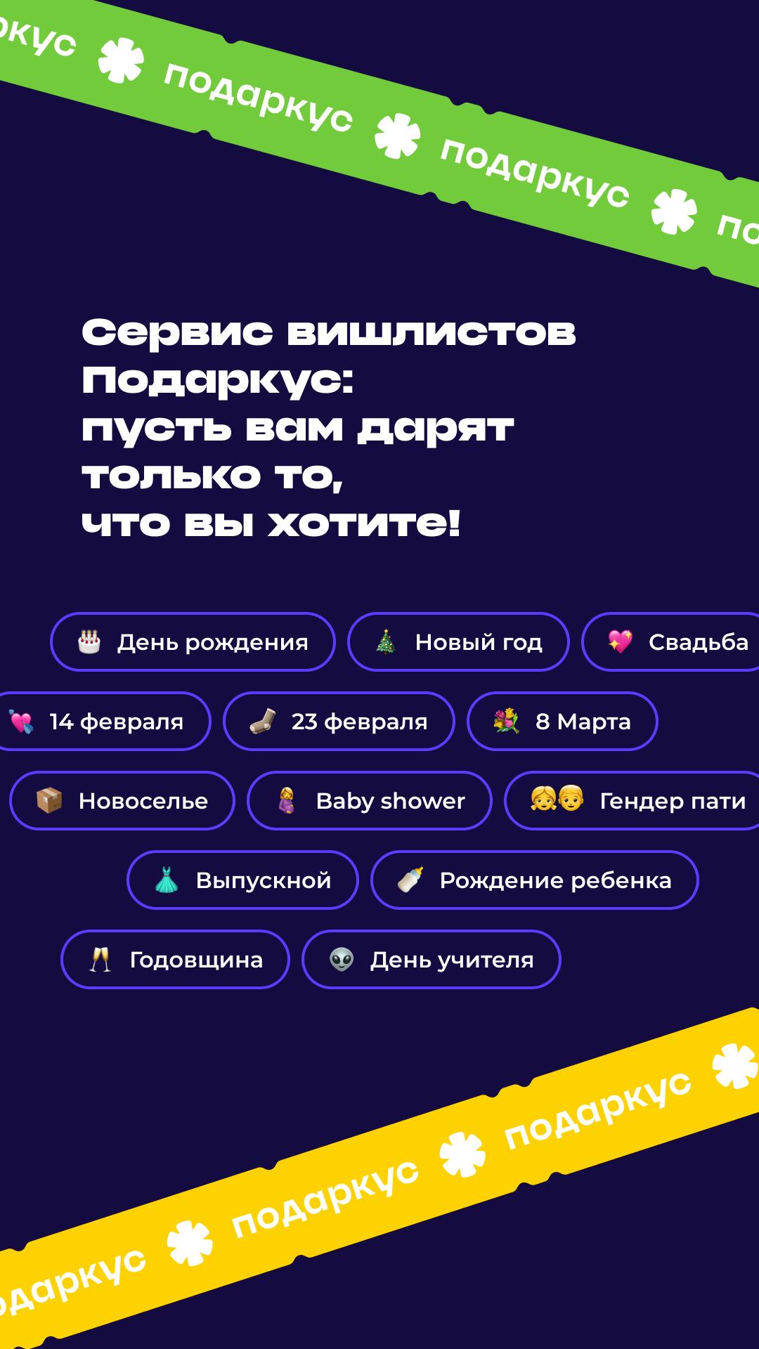 শত শত উপহারের আইডিয়া, অংশীদার স্টোর থেকে দুর্দান্ত ডিল এবং প্রতিদিন উদযাপন করার কারণ - এই সবই রাশিয়ান ভাষায় পোডারকাস উইশ লিস্ট অ্যাপ্লিকেশনে। আপনার বিশেষ দিনে শুধুমাত্র প্রয়োজনীয় এবং দরকারী উপহার গ্রহণ করুন!