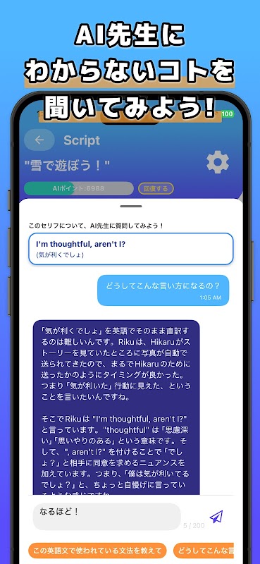 ইংরেজি কথোপকথন অনুশীলন করতে এই অ্যাপটি জাপানি ভাষায় আপনার বাস্তব কথোপকথন ব্যবহার করে।