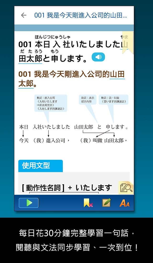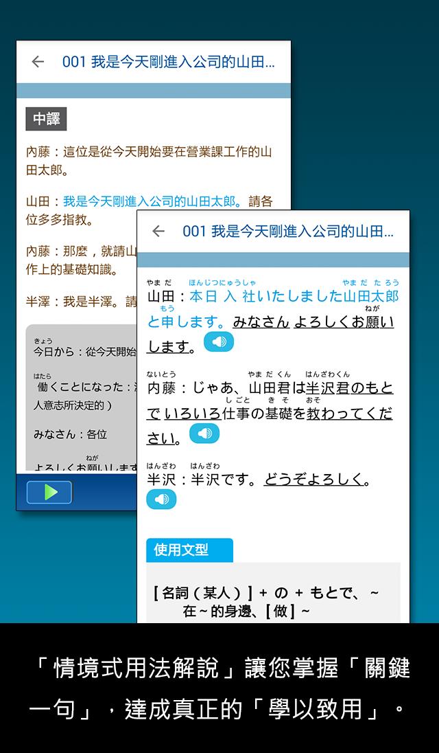 4-ইউনিট শেখার পদ্ধতির মাধ্যমে: গ্রাফিকাল [শৈলীর চিত্র], প্রম্পট [জাপানিদের দ্বারা প্রায়শই ব্যবহৃত অভিব্যক্তি শৈলী], [পরিস্থিতিগত ব্যবহারের ব্যাখ্যা] এবং [নির্দিষ্ট কথোপকথনের দৃশ্য], প্রকৃত "অ্যাপ্লিকেশন দ্বারা শিক্ষা" অর্জন করা যেতে পারে।