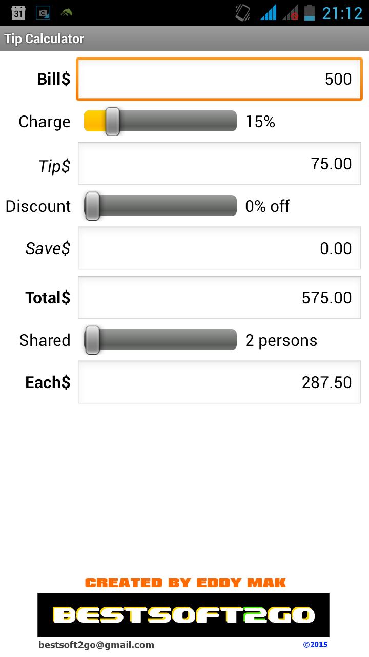 এই টিপ ক্যালকুলেটর অ্যাপ্লিকেশন দ্রুত এবং সহজেই টিপ নিরূপণ করতে পারেন না এবং শুধুমাত্র ডিসকাউন্ট সহজেই বিল বিভক্ত করতে পারেন.