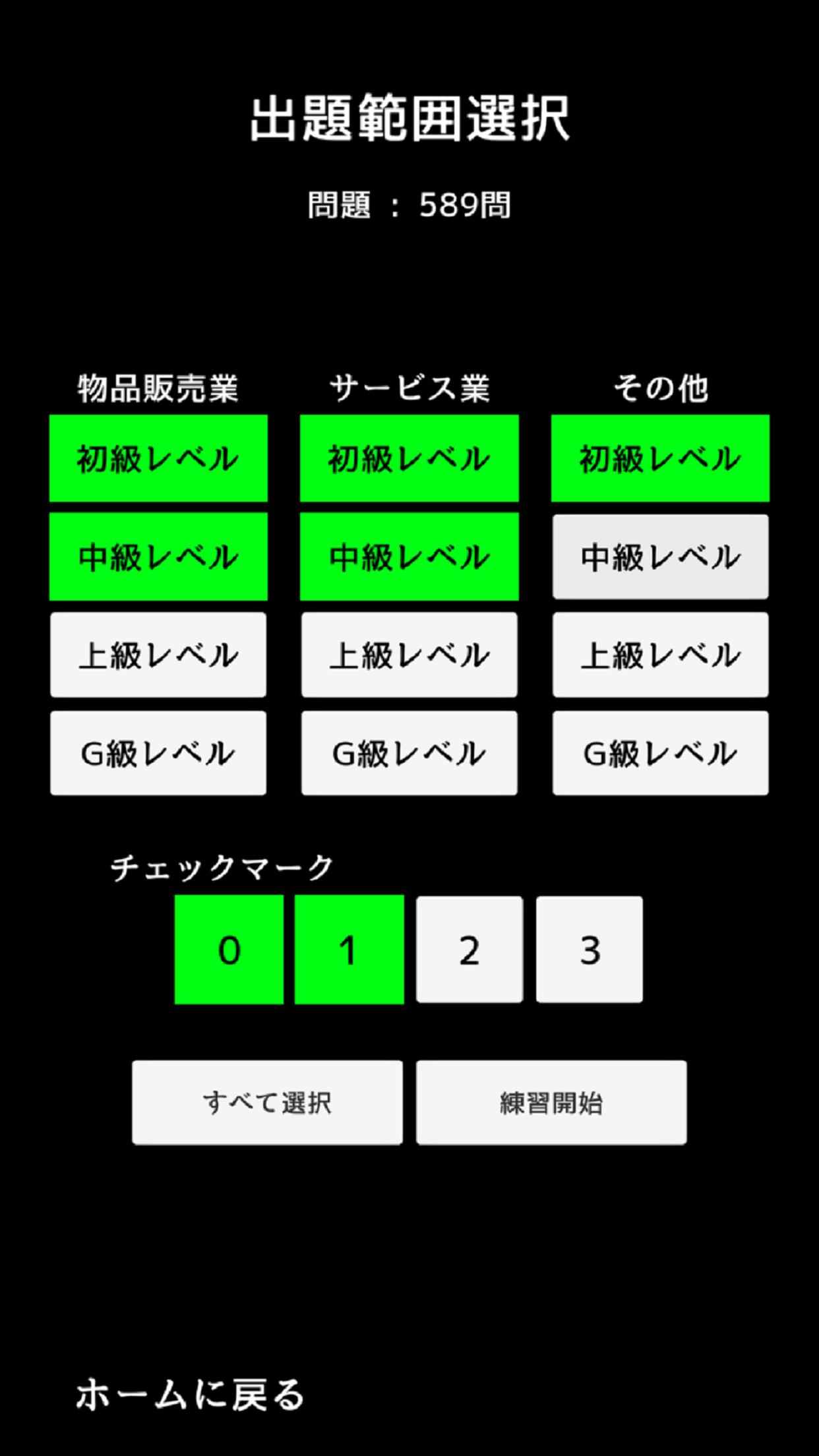 ②問題の難易度・チェックマークの数を選択して、選択した範囲の問題を繰り返し解き苦手論点を克服できる「練習モード」(※)