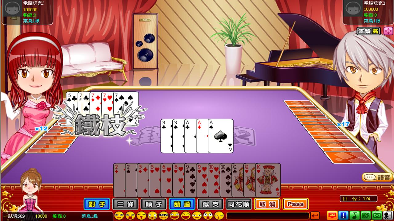 3. 若不想出牌時需按下pass,無牌可出系統自動pass,出牌秒數結束時,玩家尚未出牌,系統自動出牌或Pass