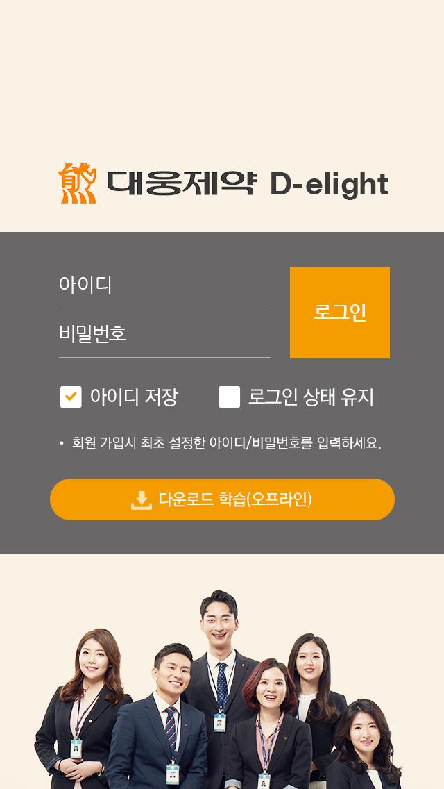 PC환경의 대웅제약 사이버연수원 D-elight(http://daewoong.hunet.co.kr)의 아이디와 비밀번호로 로그인 가능하며, 주요 서비스를 본 모바일 앱에서도 사용하실 수 있습니다.