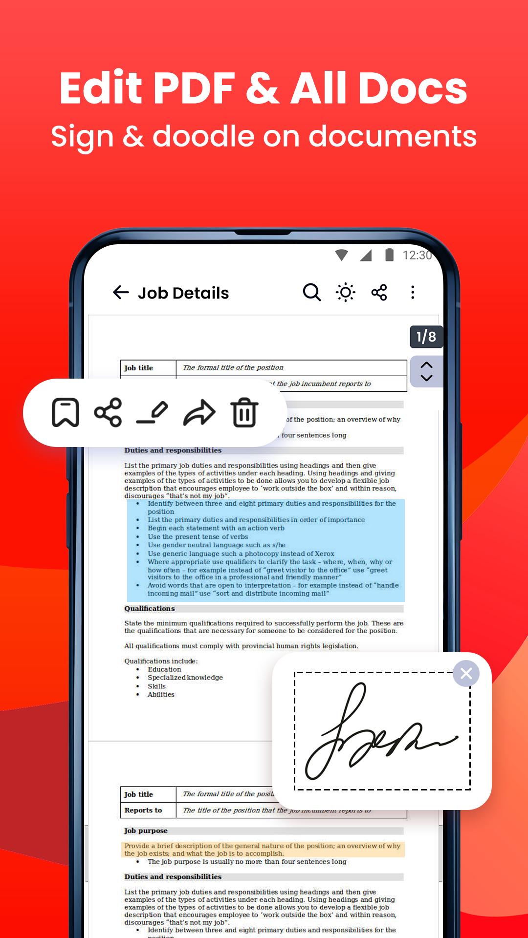 PDF Reader শুধুমাত্র একটি রিডিং অ্যাপ নয়, আপনি এটিকে পাঠ্য হাইলাইট করতে, নোট নিতে, ই-স্বাক্ষর যোগ করতে, PDF পৃষ্ঠাগুলি বুকমার্ক করতে, PDF ফাইল শেয়ার করতেও ব্যবহার করতে পারেন। শক্তিশালী টুলের সাহায্যে, আপনি কম্প্রেস করতে পারেন, ওয়াটারমার্ক যোগ করতে পারেন এবং সেইসাথে যেকোনো ধরনের ফাইলকে PDF এ রূপান্তর করতে পারেন।