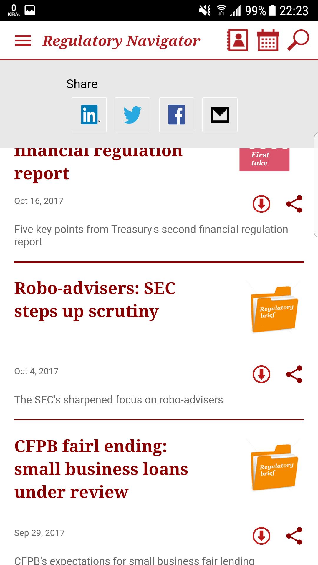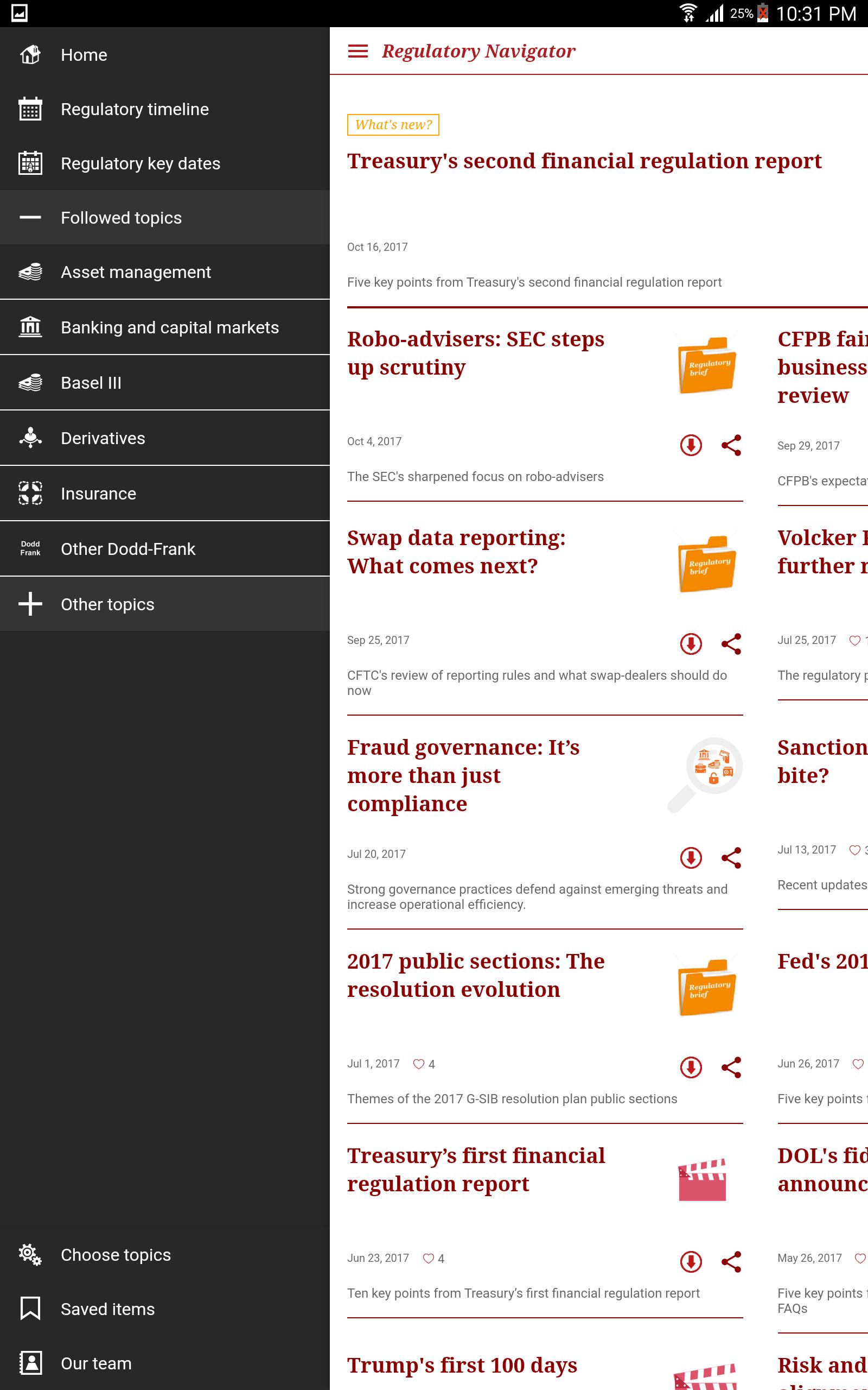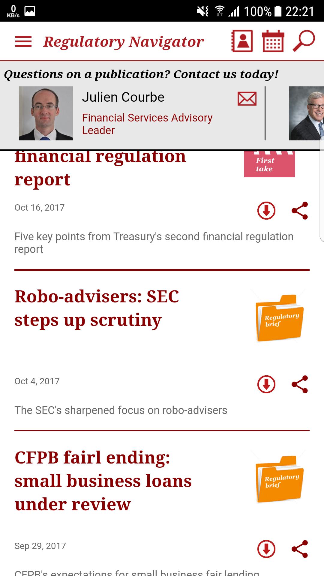 o Publications - Search or sort through a complete list of all PwC financial services regulatory publications available on the app.