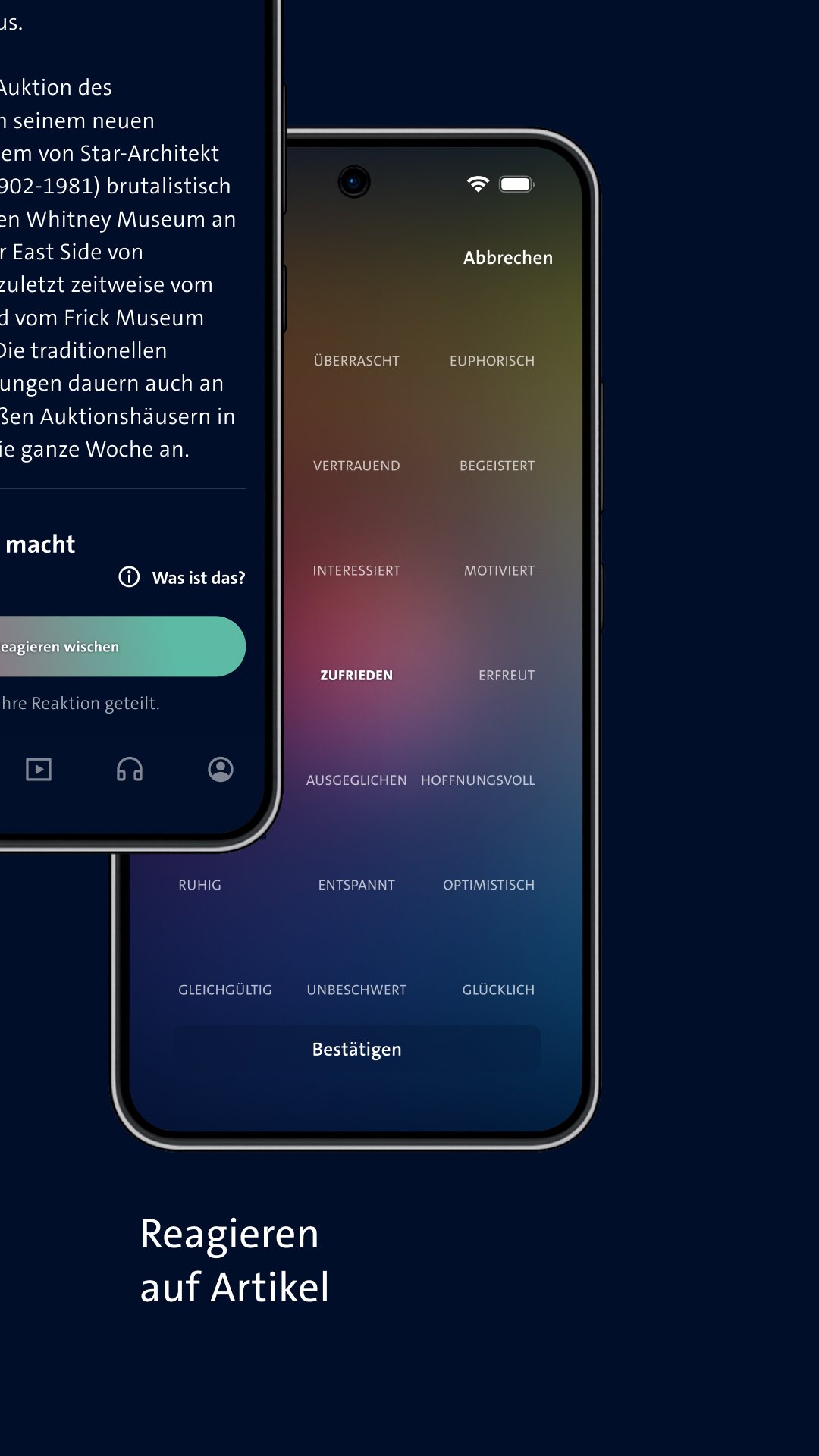 নতুন tagesschau অ্যাপে, ব্যবহারকারীরা এখন প্রতিটি নিবন্ধ তাদের মধ্যে যে আবেগ জাগিয়ে তোলে তা নির্দেশ করতে পারেন। তারপরে তারা দেখতে পারবেন যে অন্যান্য ব্যবহারকারীরা একই নিবন্ধে কীভাবে ভোট দিয়েছেন, প্রতিটি নিবন্ধের জন্য আপ-টু-ডেট ব্যবহারকারীর অনুভূতির সূচক তৈরি করে।