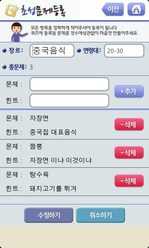 2. 나의 초성문제 : 내가 작성한 초성문제를 관리하는 메뉴, 출제 및 참석자도 알수 있습니다.