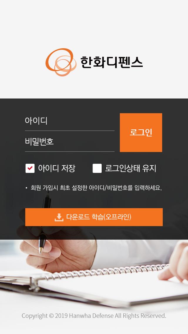 PC환경의 한화디펜스 사이버연수원 (http://defense.hunet.co.kr)의 아이디와 비밀번호로 로그인 가능하며, 교육과정 안내/신청, 나의 강의실 등 주요 서비스를 본 모바일 앱에서도 사용하실 수 있습니다.