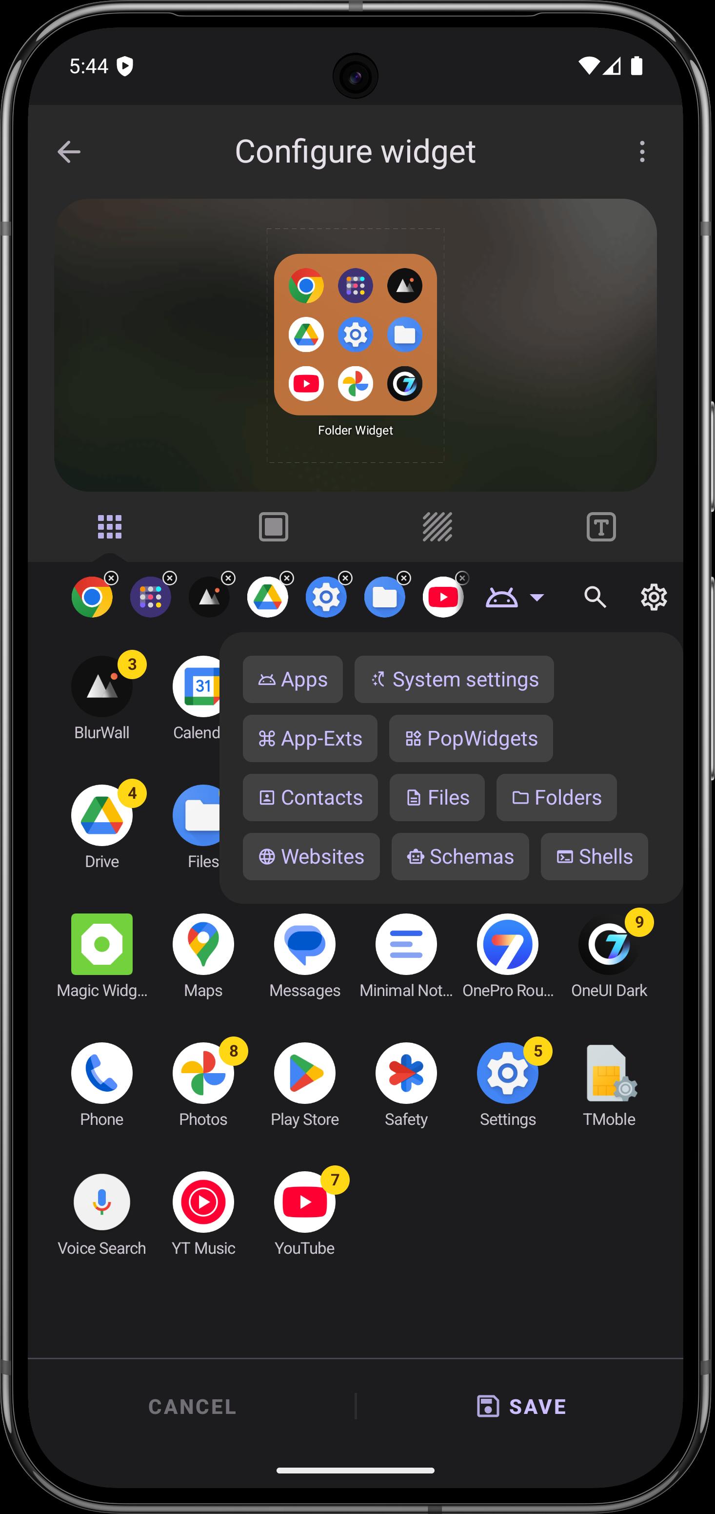 Widget pop-up - Selecione um ou mais widgets pop-up para colocar em uma pasta grande ou ícone na tela inicial Inicializador