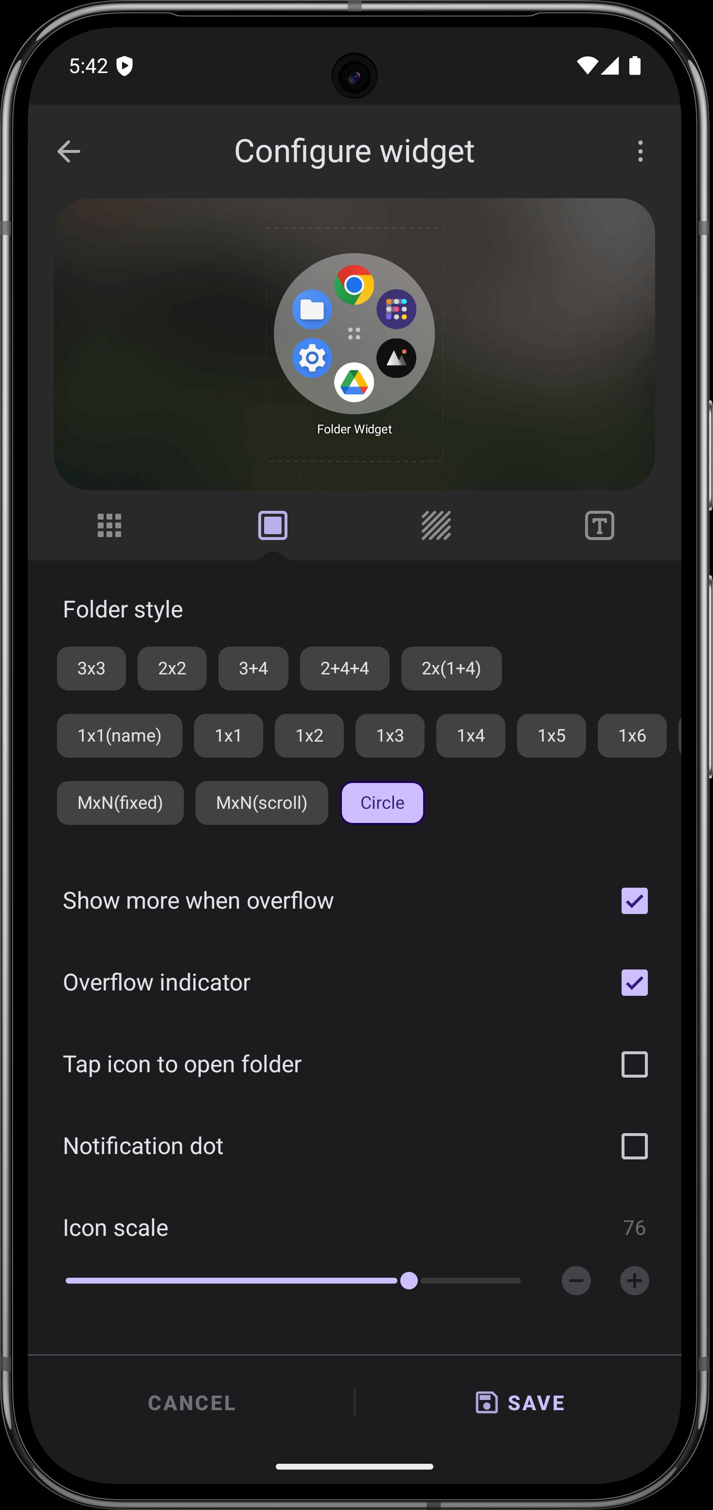 - Tamanho da grade da pasta e visibilidade do nome do ícone personalizados