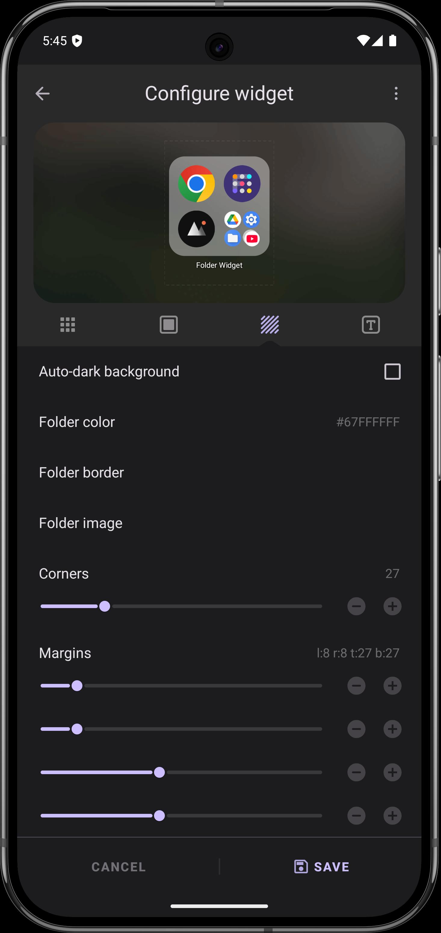 - Tipo de estrutura do widget de pasta: 2x2, 3x3, 4x4, 3+4, 1x5, 2x3, 3x2, MxN (corte), MxN (rolagem), círculo e muito mais