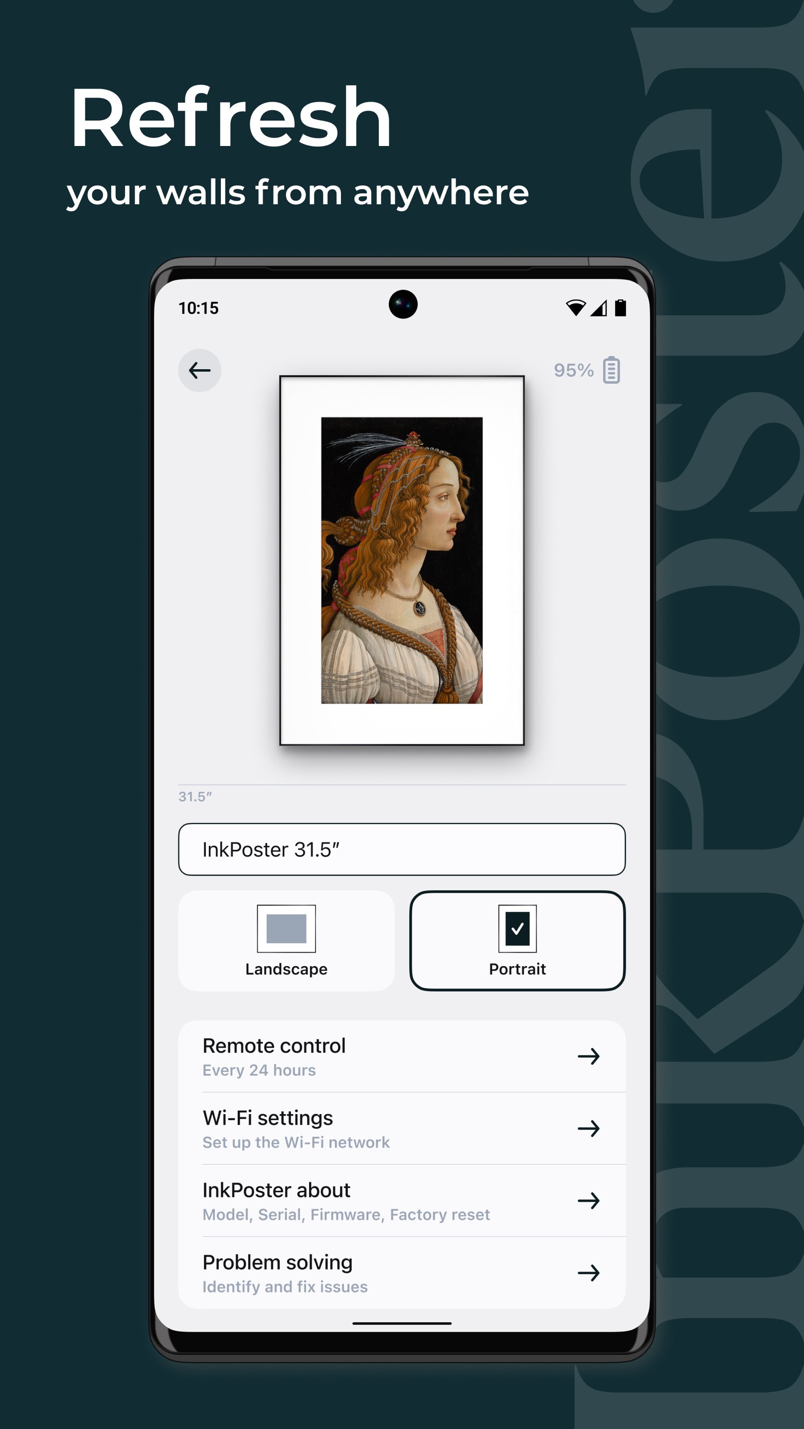 Gerencie um ou vários InkPosters – tudo pelo aplicativo. Conecte vários pôsteres digitais em diferentes cômodos ou locais e envie obras de arte selecionadas com apenas alguns toques. Crie uma parede de arte deslumbrante combinando vários InkPosters, escolha estilos, épocas ou paletas de cores para criar uma instalação verdadeiramente única.
