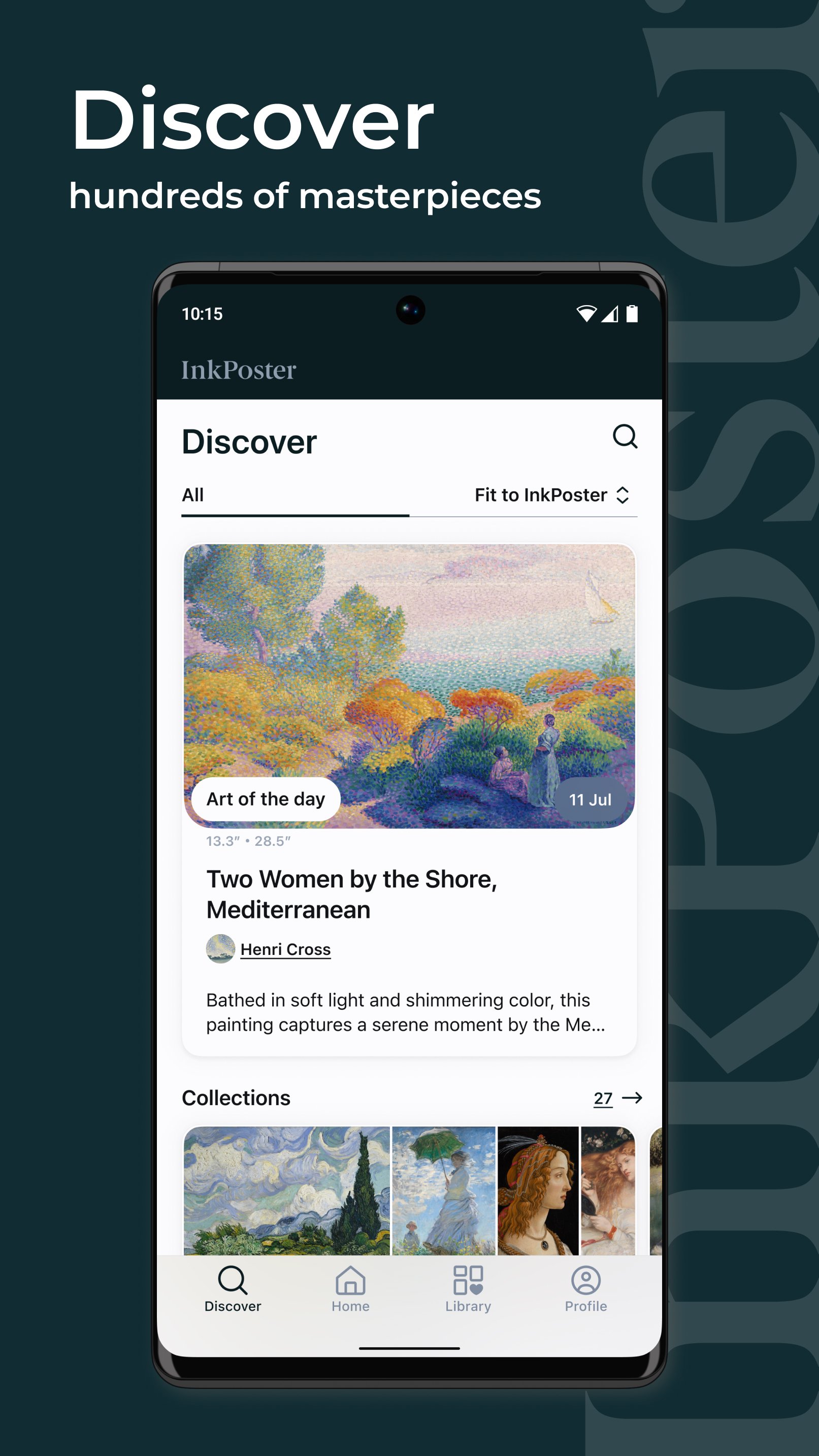 O aplicativo InkPoster é sua porta de entrada para milhares de obras-primas vibrantes, de artistas icônicos e talentos em ascensão, selecionadas a dedo por consultores de arte profissionais. Desenvolvido exclusivamente para o InkPoster, o pioneiro em pôsteres digitais coloridos em ePaper, este aplicativo é o seu controle remoto para arte dinâmica e sustentável. Descubra, selecione e exiba arte que reflita sua identidade com apenas alguns toques.
