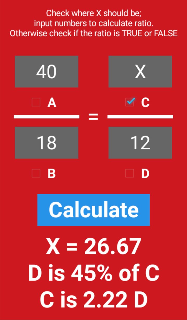 Ratio is a way of showing the relationship between two numbers. "Ratio" is an App, which solves ratios for the missing value X or tells you, if the ratio you input is True or False. It is also intended to be a teaching tool and an excellent tool for students, who are about to learn ratio. Touch and hold the result label to restore.Last updated on Jul 23, 2018