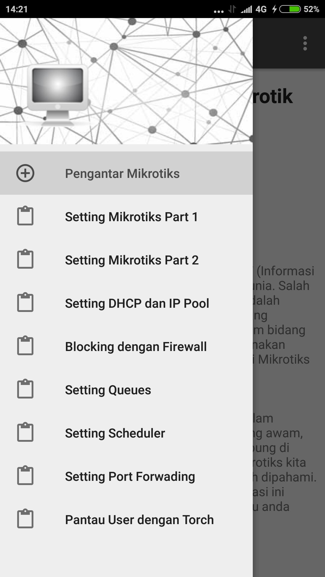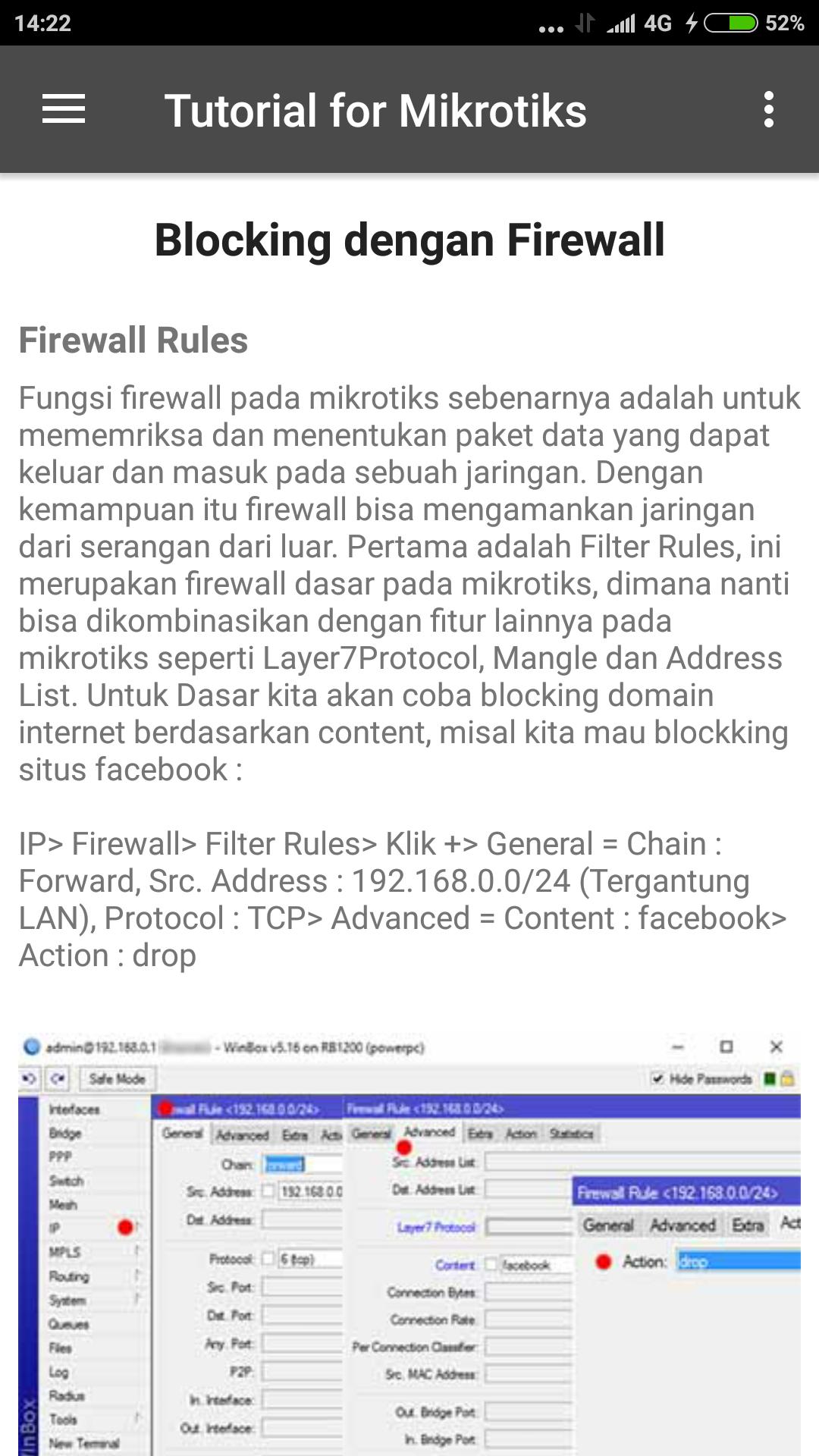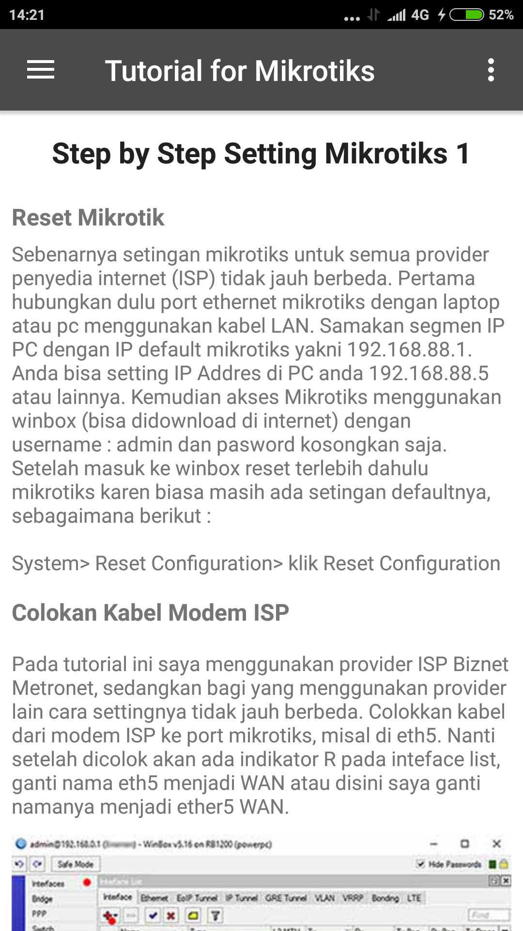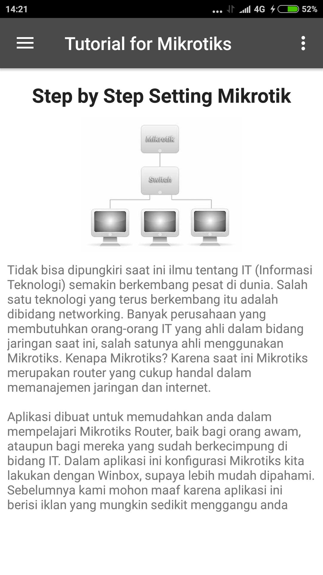 Aplikasi ini dibuat untuk memudahkan anda belajar mikrotiks, baik yang awam maupun bagi mereka yang sudah berkecimpung di bidang IT. Pada aplikasi ini, anda akan dituntun untuk melakukan konfigurasi pada mikrotiks step by step. Selain itu aplikasi ini juga disertai gambar yang lebih memudahkan anda dalam belajar. Semua tutorial yang ada di dalam aplikasi ini sudah dites terlebih dahulu, sehingga apabila anda mengikuti langkah-langkahnya dengan benar, maka anda sudah bisa menjadi seorang IT Networking.Last updated on Jun 1, 2017