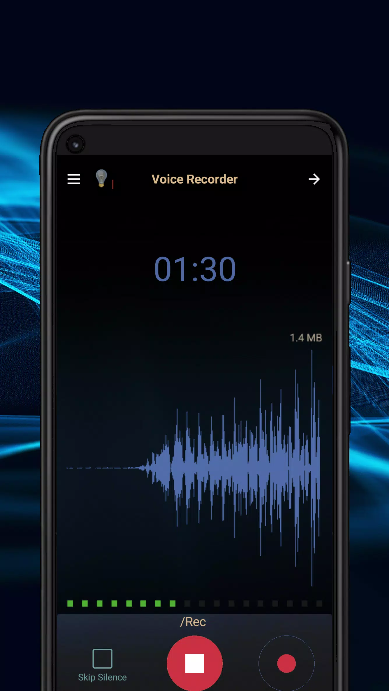 Durante a gravação, que pode ser pausada, a onda sonora é desenhada em tempo real, assim como sua amplitude (decibéis).