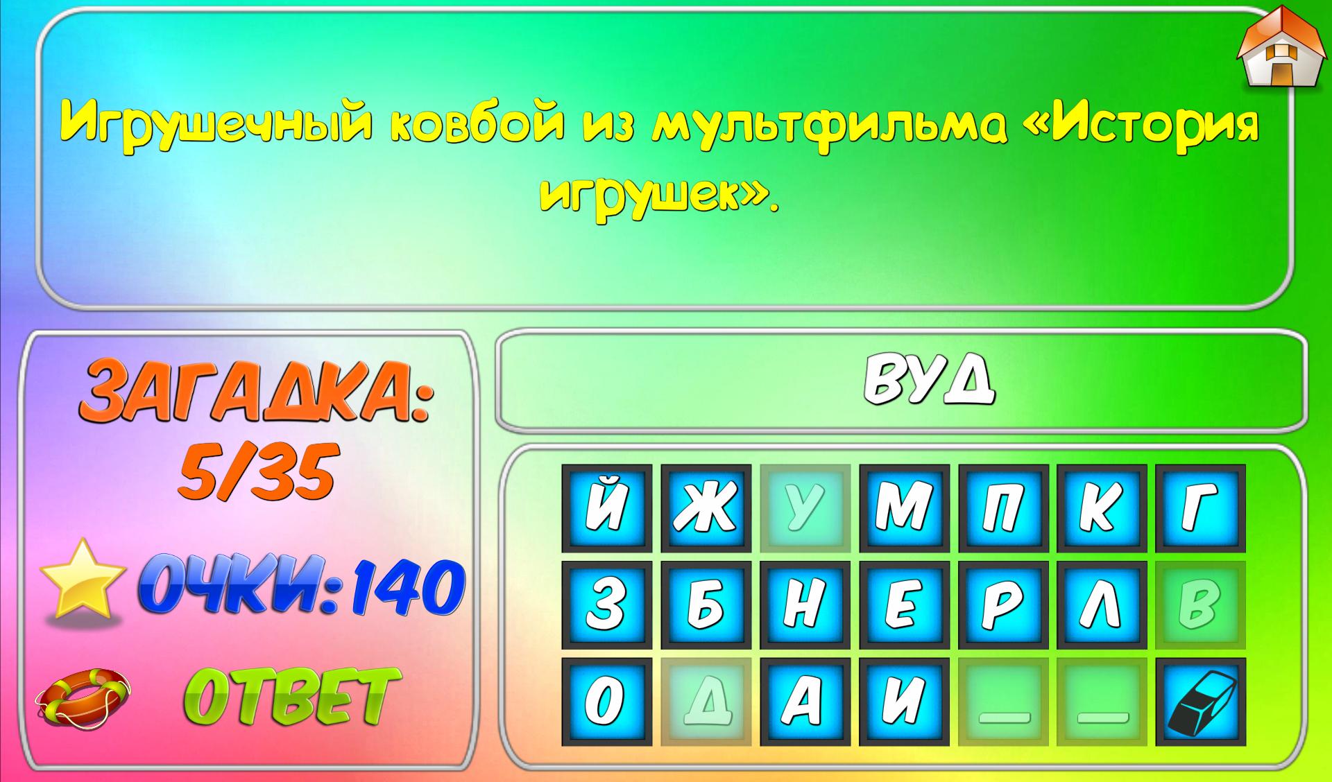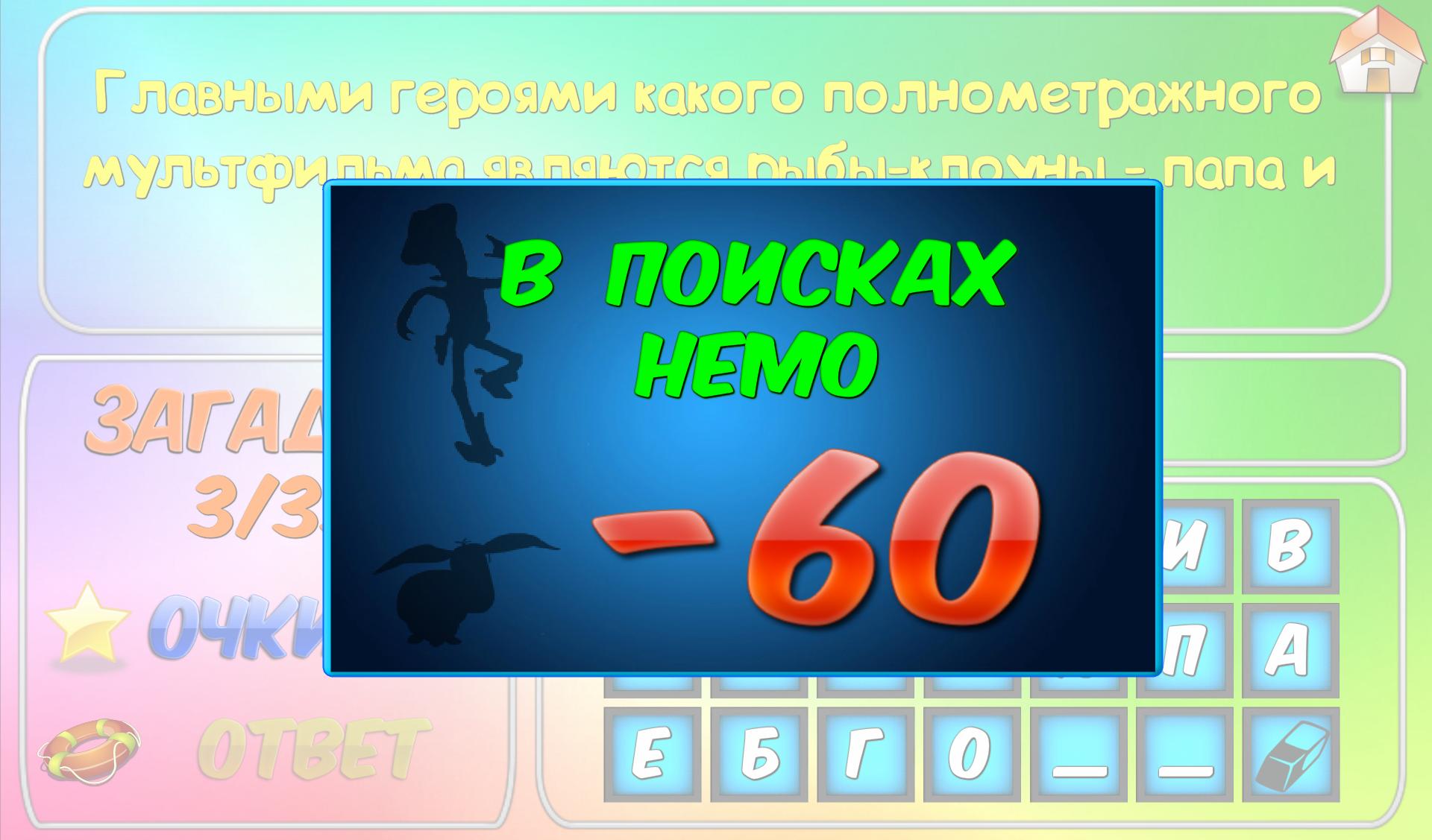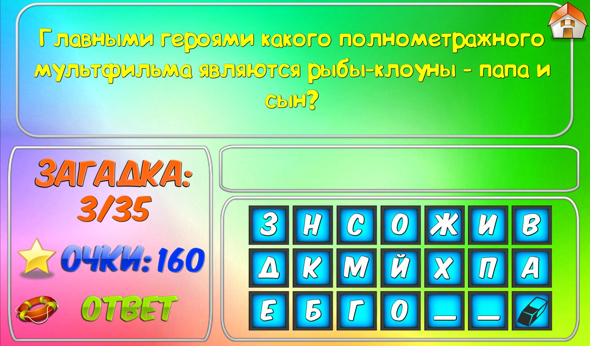 Игра понравится любителем мультфильмов, фильмов, головоломок, ребусов и викторин. Интересно будет играть как взрослым, так и детям.