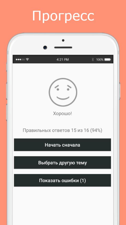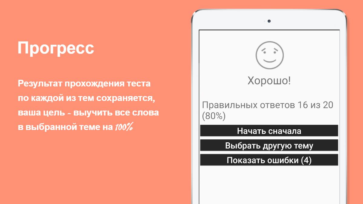 通过对所选主题的测试后,您可以查看错误。另外,每个主题的测试结果都已保存,您的目标是100%学习所选主题中的所有单词。
