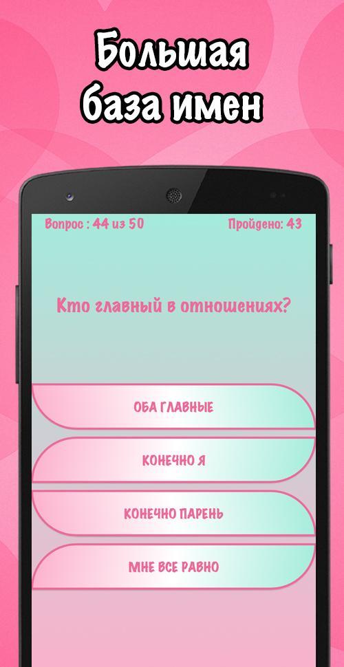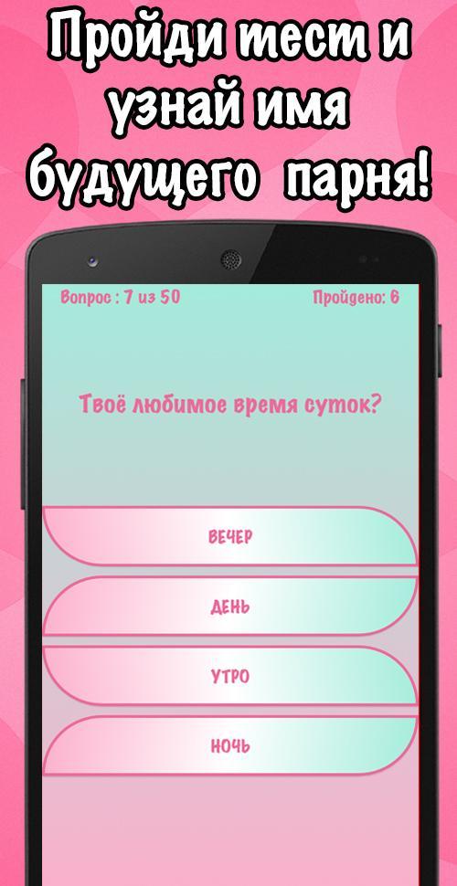 Ответив на несложные вопросы, ты сможешь с максимальной вероятностью узнать имя своего будущего парня. Это поможет тебе сделать правильный выбор или обратить внимание на человека, предназначенного самой судьбой. Увлекательный тест на имя будущего парня поможет каждой девушке избежать ошибок и разочарований в личной жизни, найти взаимную любовь и построить прочные отношения. В нашей базе есть всевозможные мужские имена, поэтому ты получишь точный результат теста.