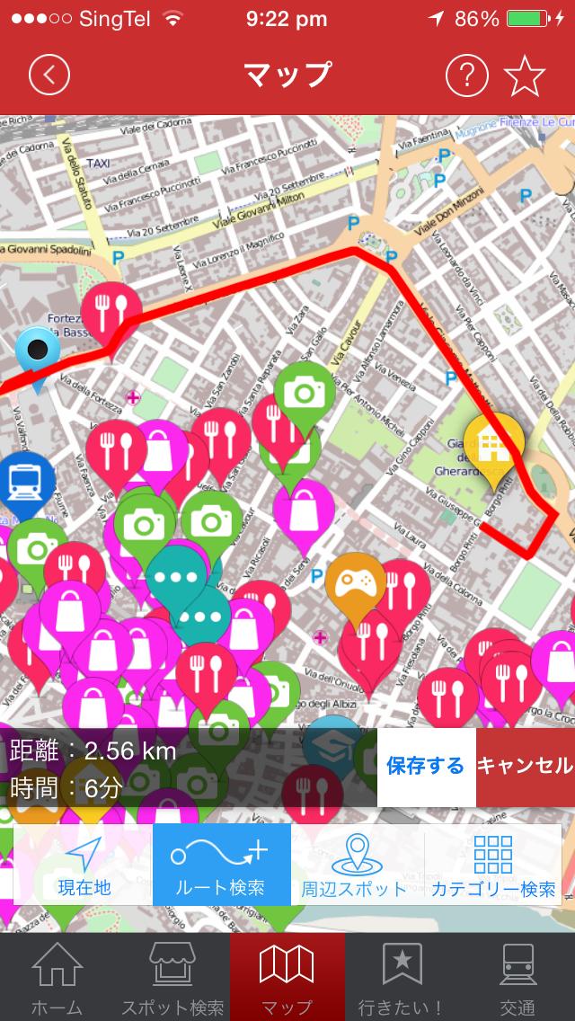 ①現在位置(GPS)、ピンドロップした位置、スポットの組み合わせからルート検索ができます。