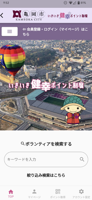 “龟冈市Ikiiki Kenko积分系统”是一款通过参加京都府龟冈市的志愿者活动来赚取积分的应用程序。