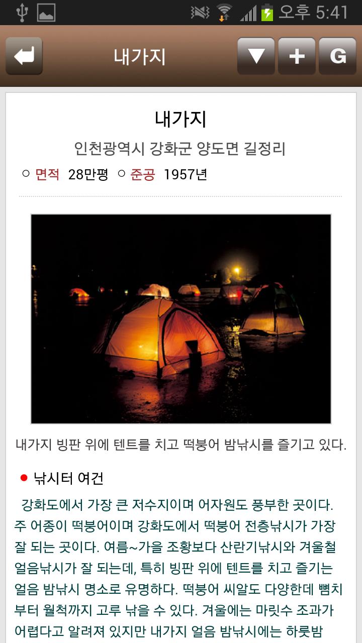 인천 경기 지역 및 강원 지역의 저수지를 100% 수록하여 총 803개 낚시터의 간략한 정보를 수록하고 있습니다.