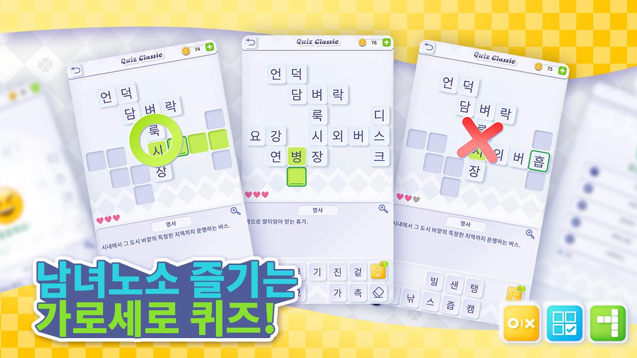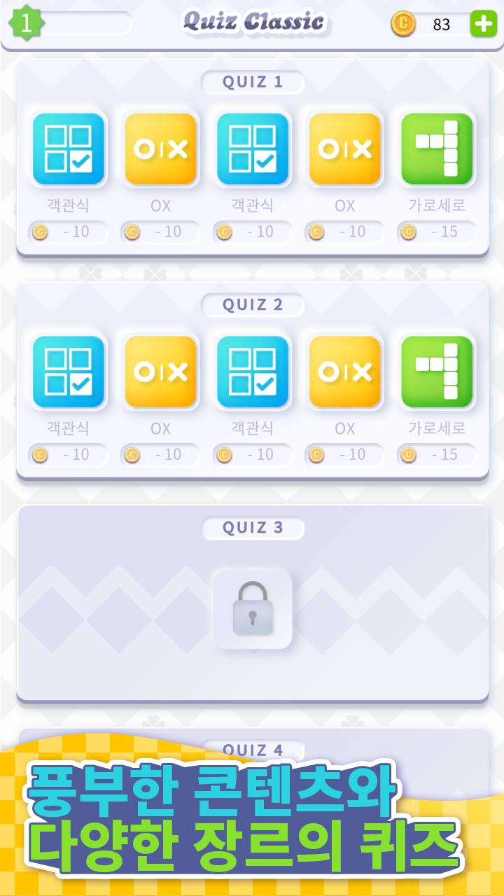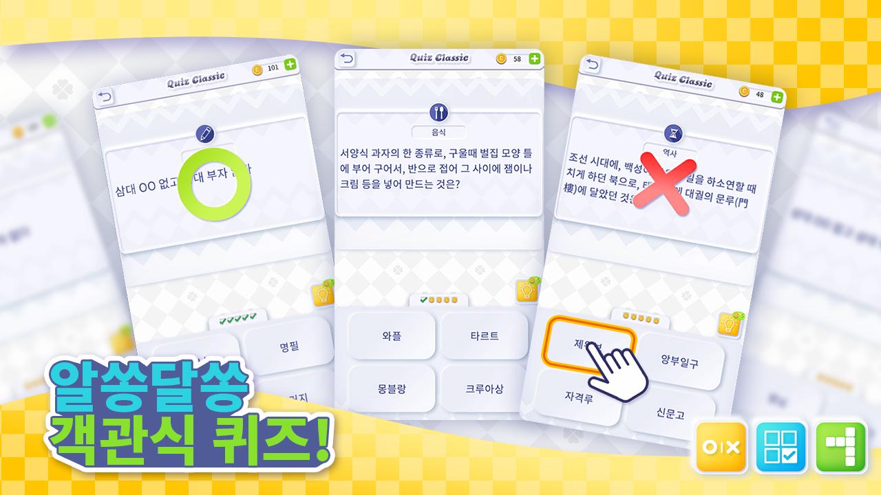 从简单的谚语,词语到社会和经济,都有各种各样的类型,您可以挑战各种测验,例如选择题,OX,水平和垂直。