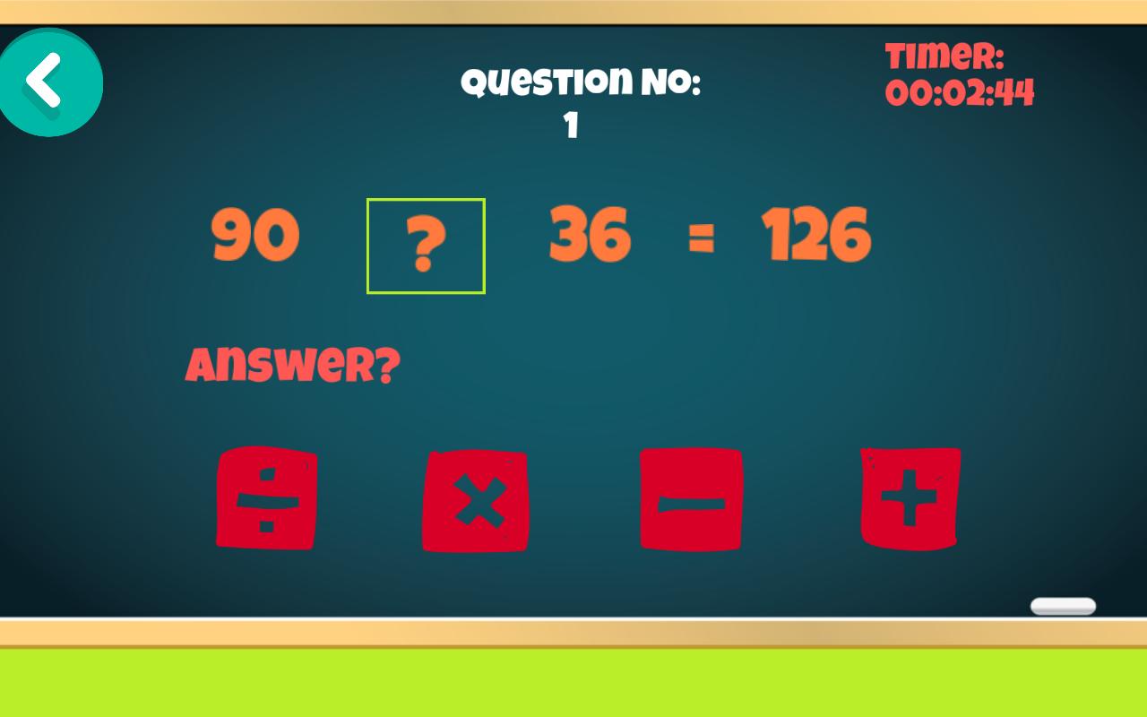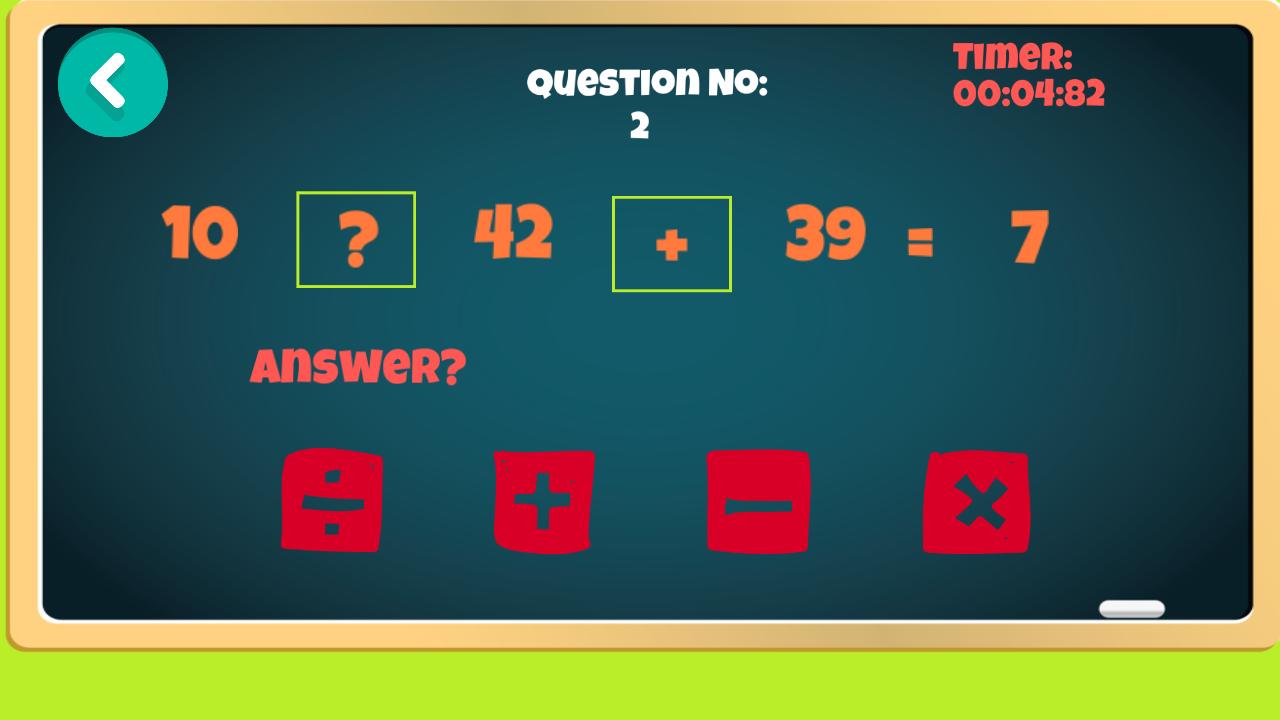 Choose the correct answer from either addition,subtraction,multiplication or division to solve the game. Get the right calculation by selecting the correct math operation.